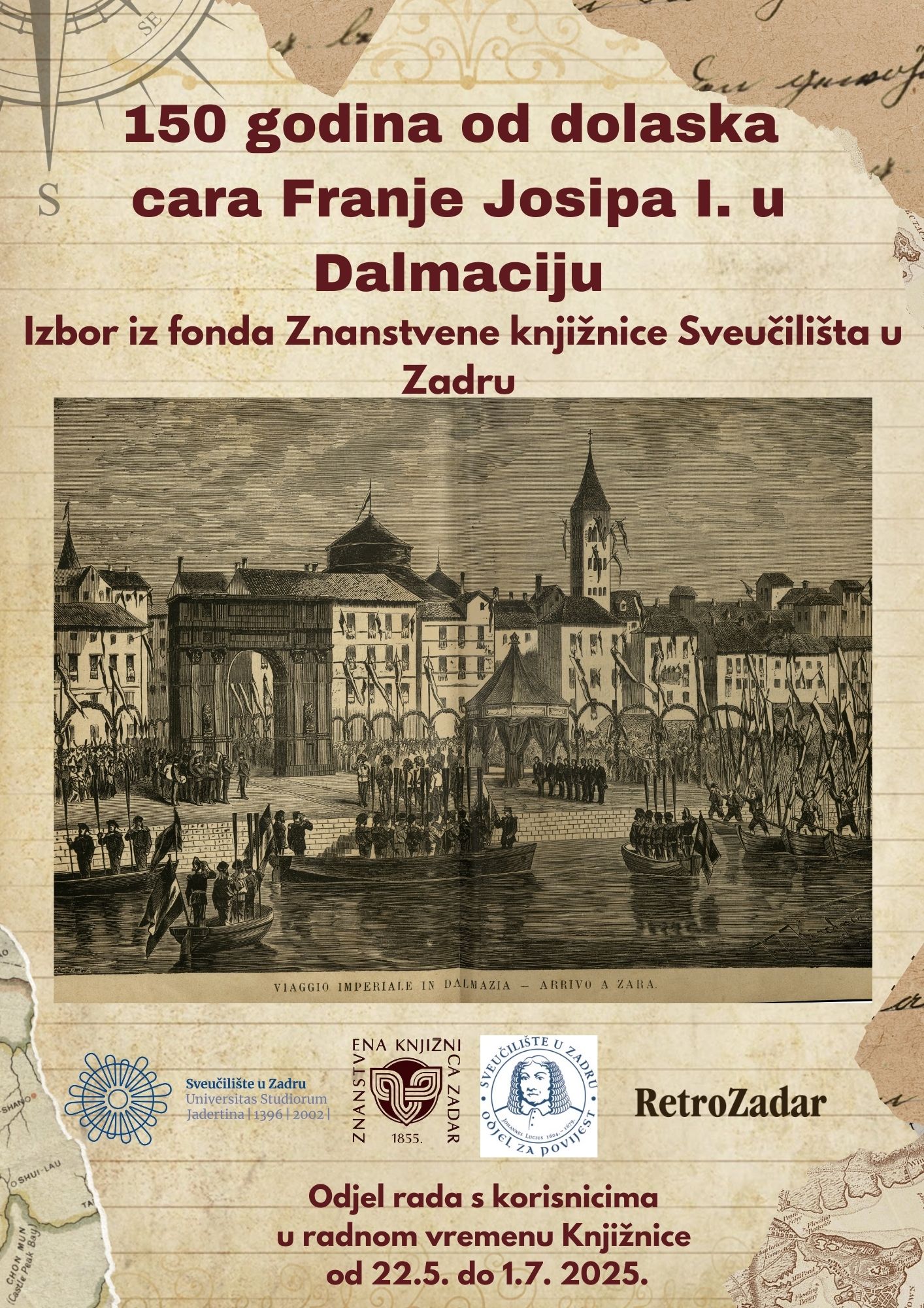 Izbor iz fonda povodom obilježavanja 150 godina od dolaska cara Franje Josipa I. u Zadar i Dalmaciju možete pogledati od četvrtka 22. svibnja do utorka 1. srpnja 2025. godine u radnom vremenu Knjižnice na Odjelu rada s korisnicima Znanstvene knjižnice Sveučilišta u Zadru.