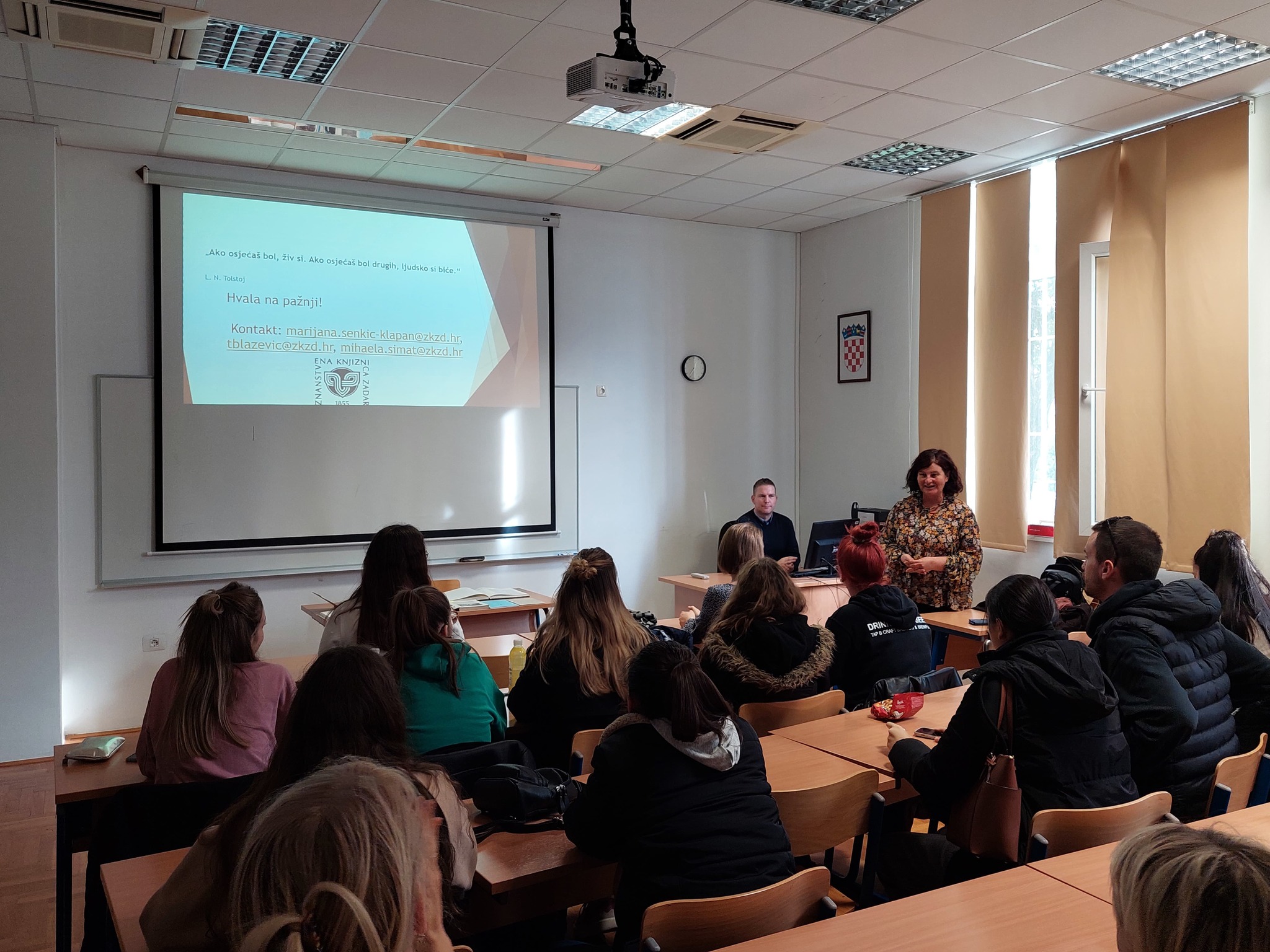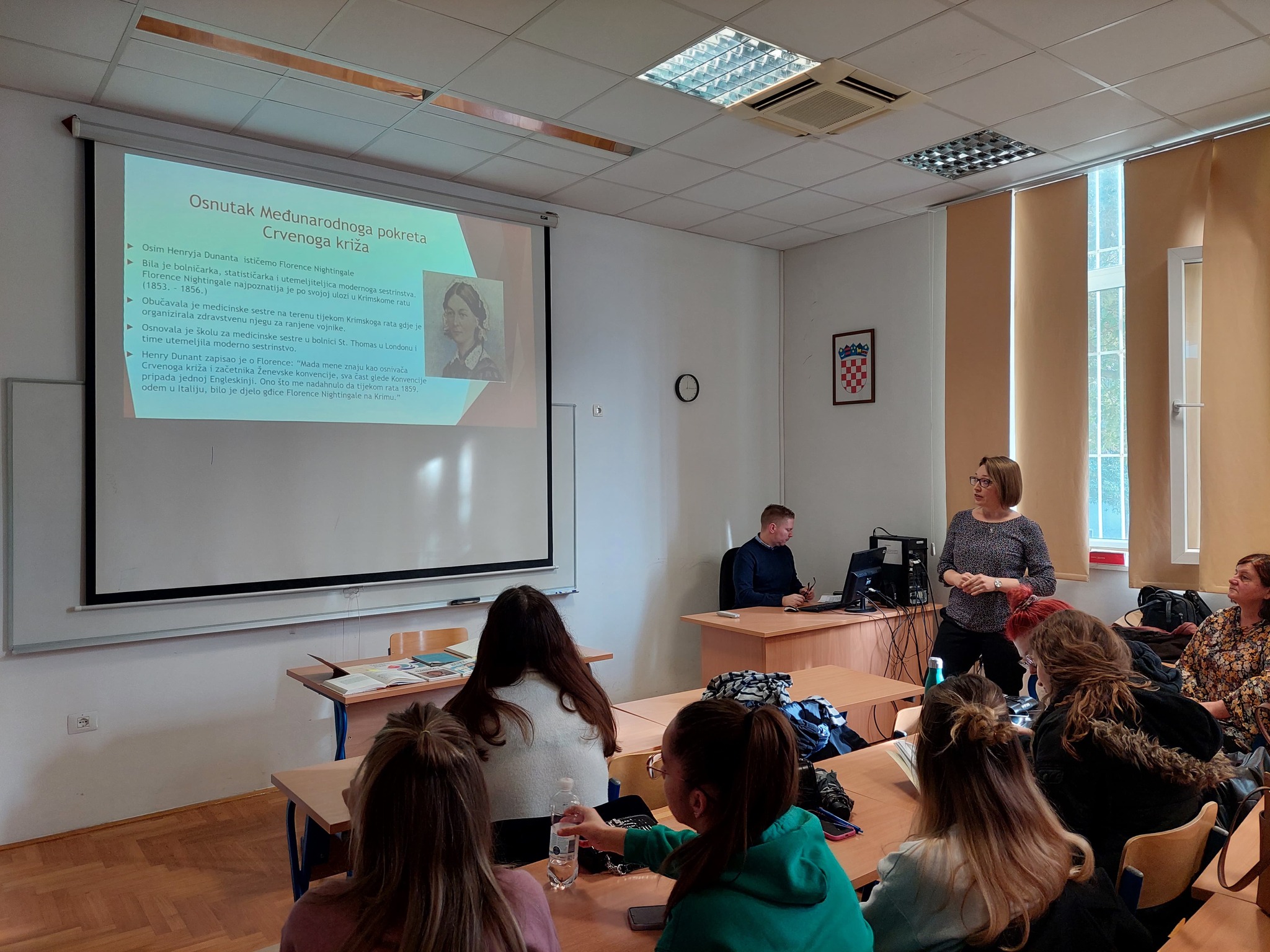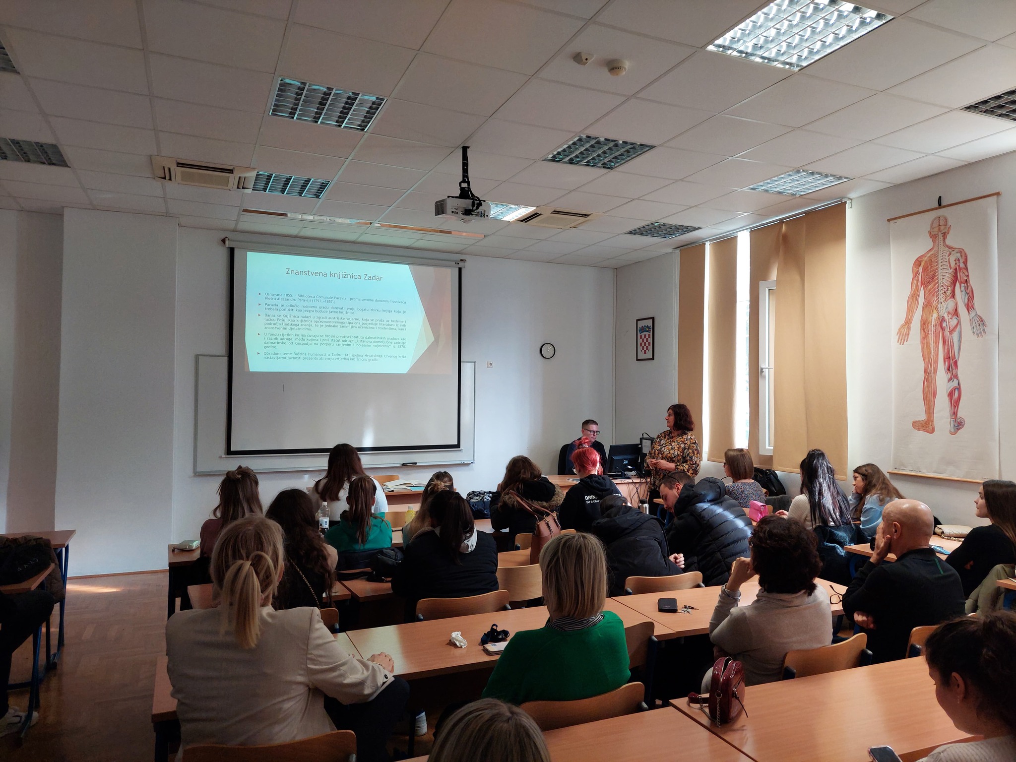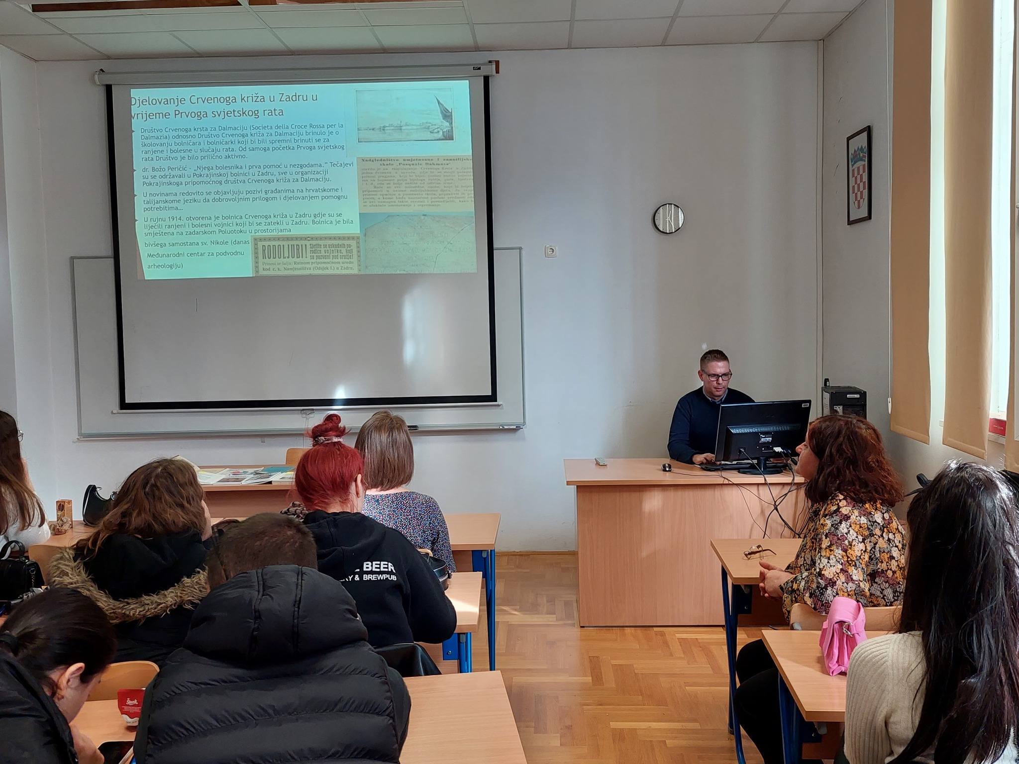 Nalazimo se u prosincu, mjesecu darivanja i volonterstva koje je jedan od najvidljivijih izraza solidarnosti. Tim povodom studenti 1. godine prijediplomskog studija sestrinstva (Odjel za zdravstvene studije Sveučilišta u Zadru) poslušali su predavanje na temu „Baština humanosti u Zadru: 145 godina Hrvatskoga Crvenog križa“. Predavanje su održali autori izložbe v. d. ravnatelja Znanstvene knjižnice Zadar Marijana Senkić-Klapan, Tomislav Blažević i Mihaela Šimat, diplomirani knjižničari. Studentima smo približili fond Znanstvene knjižnice Zadar, prenijeli poruku humanosti organizacije Crvenog križa, te istaknuli kako je upravo Zadar kolijevka Hrvatskog Crvenog križa.
