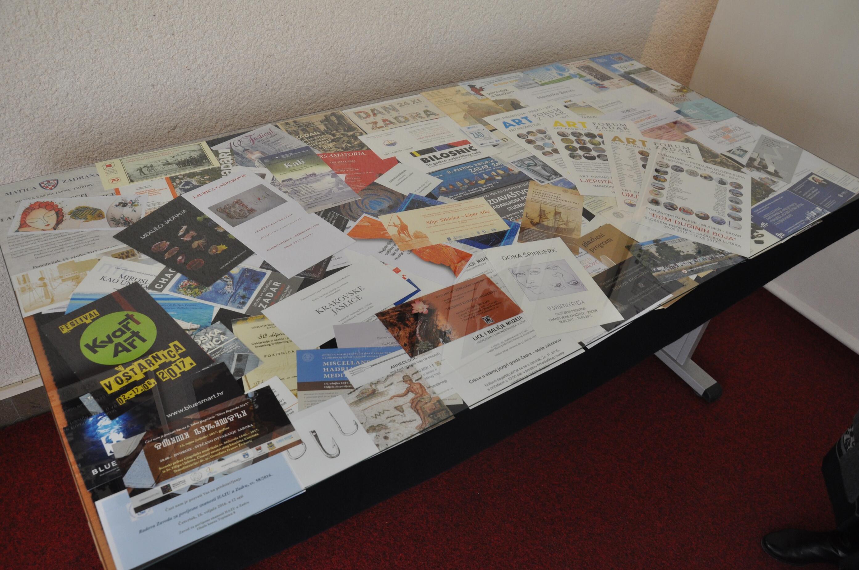 Izložen je izbor izdanja tiskanih omeđenih i serijskih publikacija, audiovizualne građe zadarskih autora i izdavača te plakata društvenih, kulturnih i sportskih događanja u proteklom jednogodišnjem razdoblju.