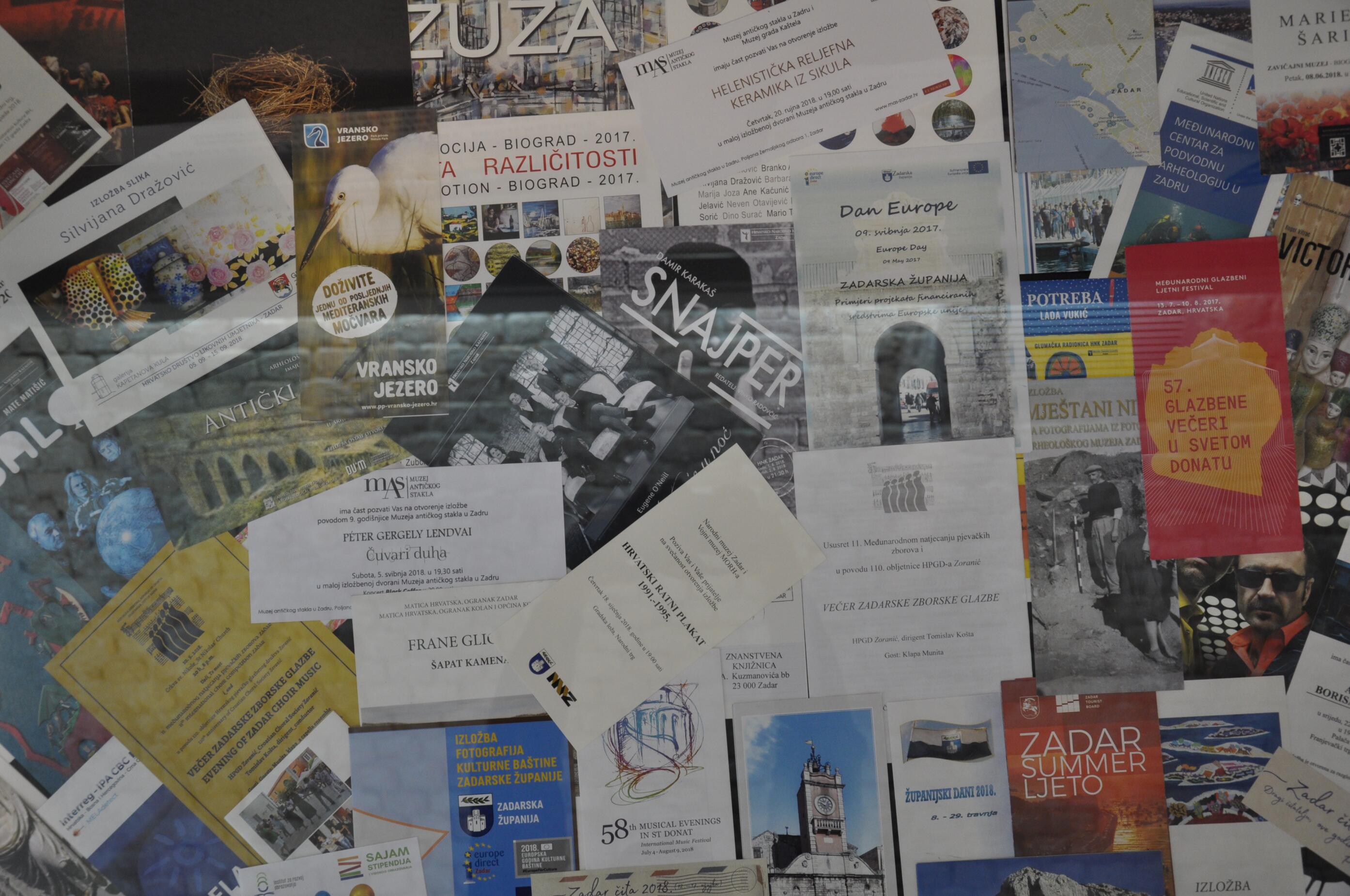 Izložen je izbor izdanja omeđenih i serijskih publikacija, audio vizualne građe izdavača s područja Zadarske županije te plakata društvenih, kulturnih i sportskih događanja u proteklom jednogodišnjem razdoblju.