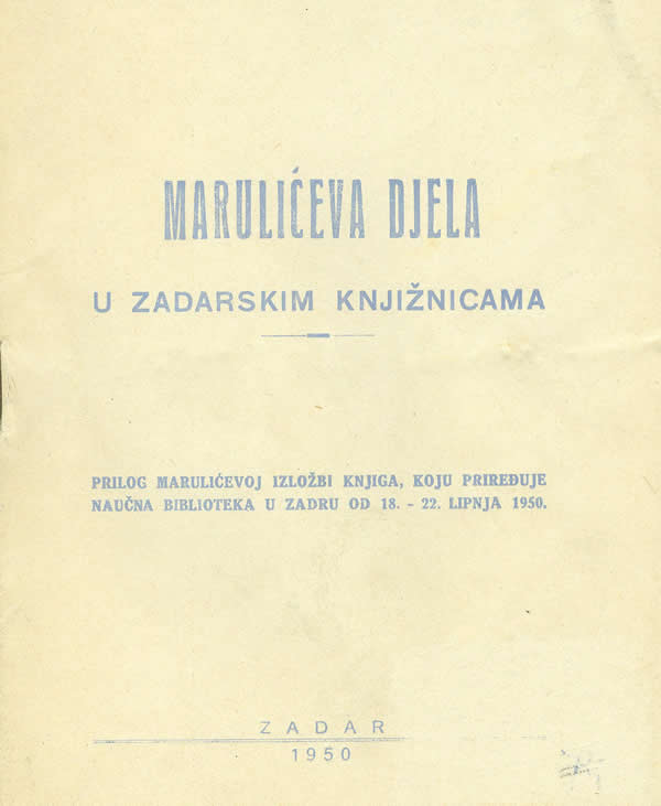 Marulićeva djela u zadarskim knjižnicama : prilog Marulićevoj izložbi knjiga, koju priređuje Naučna biblioteka u Zadru od 18.-22. lipnja 1950. / [Vjekoslav Maštrović]. – 1950.