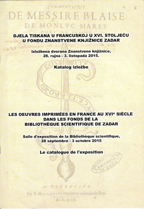 Djela tiskana u Francuskoj u XVI. stoljeću u fondu Znanstvene knjižnice Zadar : izložbena dvorana Znanstvene knjižnice, 28. rujna - 3. listopada 2015. : katalog izložbe = Les oeuvres imprimees en France au XVI siecle dans les fonds de la Bibliotheque scientifique de Zadar : salle d'exposition de la Bibliotheque scientifique, 28 septembre - 3 octobre 2015 : le catalogue de l'exposition / [priredila, prepare par Milenka Bukvić ; autor predgovora, auteur de l'avant-propos Milenka Bukvić ; kataložna obrada, cataloguement Milenka Bukvić ; redaktura zapisa, redaction Željka Aleksić ; prijevod na francuski jezik, traduction en francais Barbara Vodanović, Tea Eschebach]. – 2015.