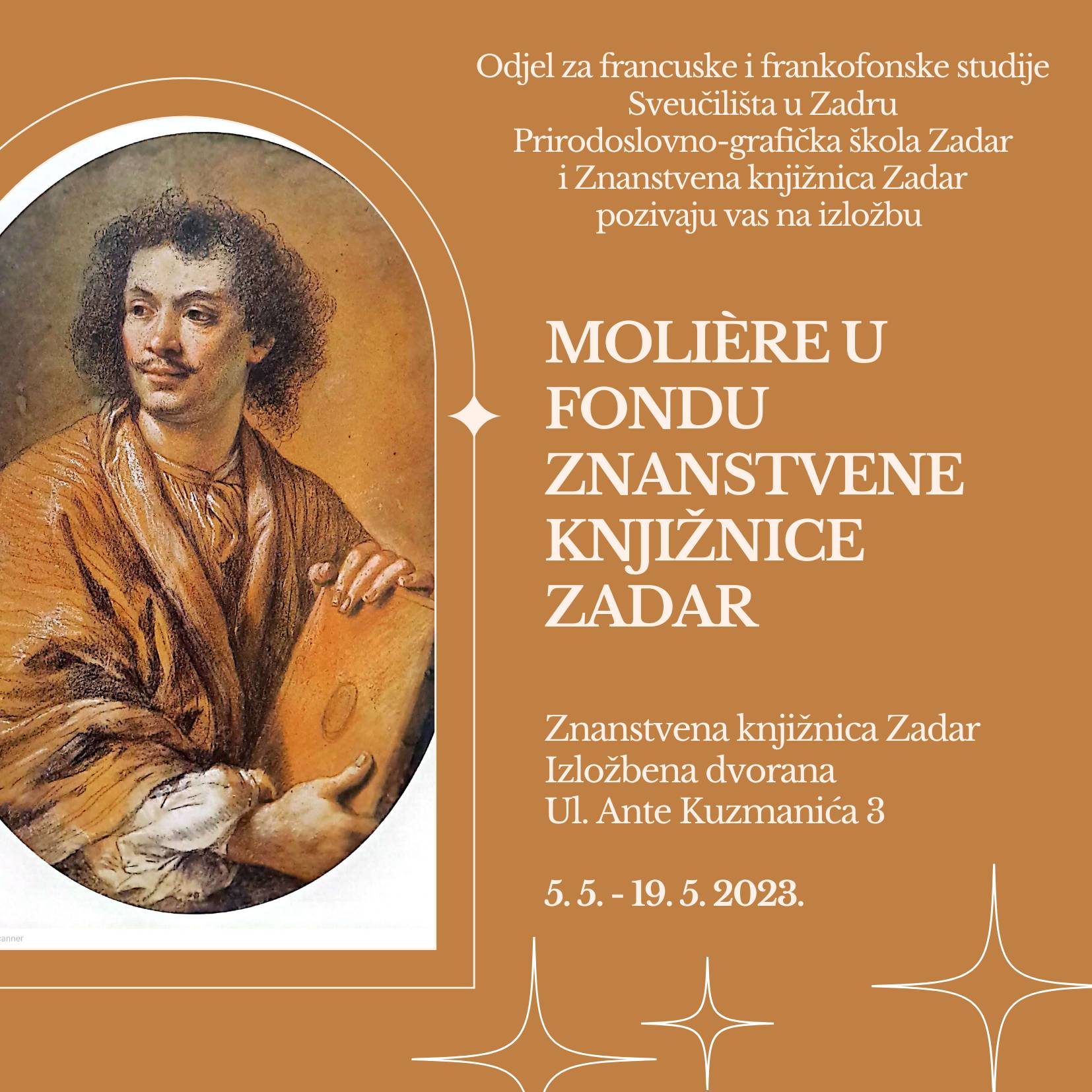Odjel za francuske i frankofonske studije Sveučilišta u Zadru, Prirodoslovno-grafička škola Zadar i Znanstvena knjižnica Zadar pozivaju vas na otvorenje izložbe Moliere u fondu Znanstvene knjižnice Zadar u petak 5. svibnja 2023. godine u 12 sati.