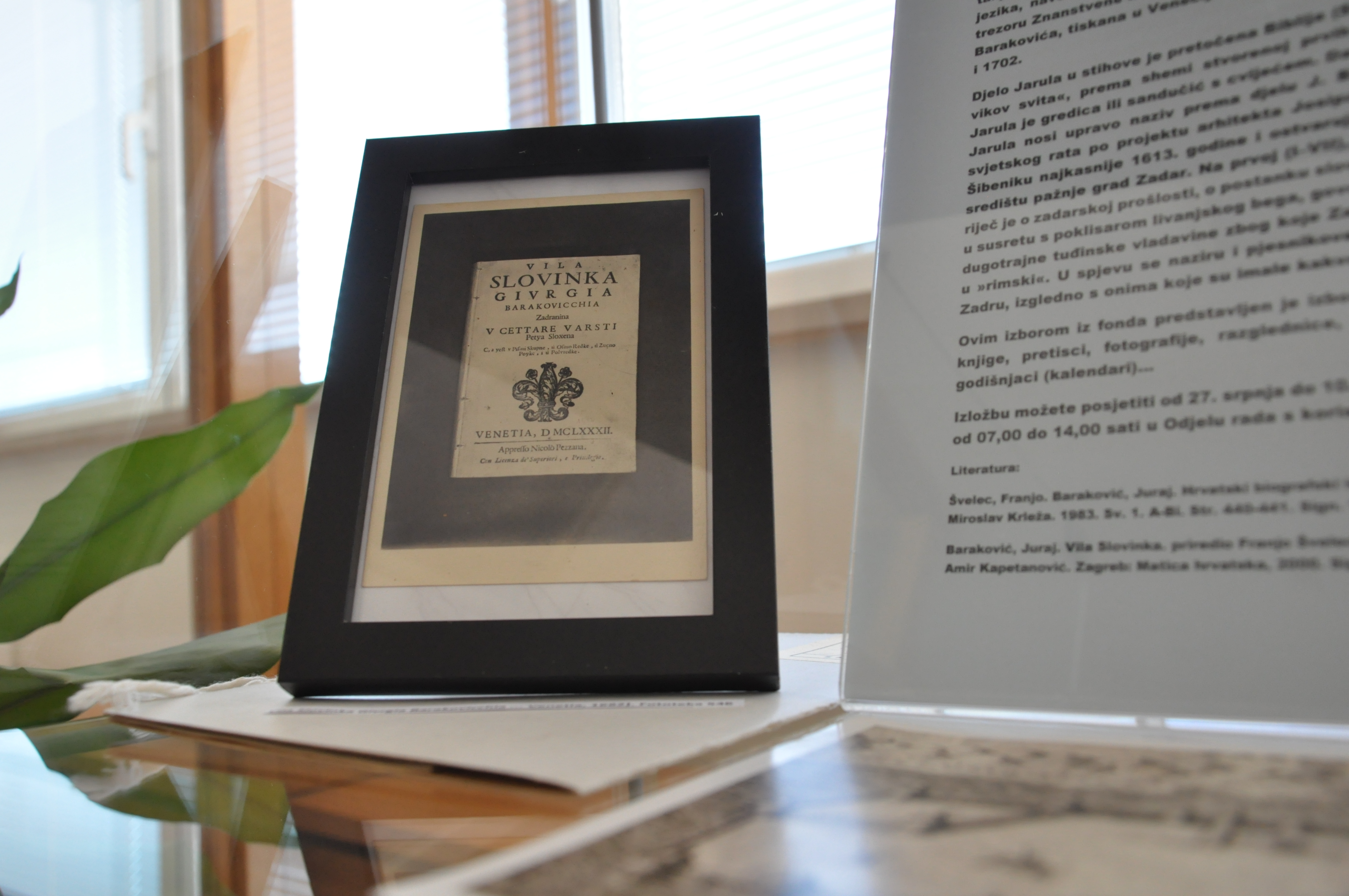 U susret obilježavanju 395. obljetnice smrti hrvatskog pjesnika Jurja Barakovića koja se obilježava 1. kolovoza, Znanstvena knjižnica Zadar priredila je izbor iz fonda. Juraj Baraković rođen je na obiteljskom dobru u Plemićima kod Zadra 1548. Osnovnu i humanističku školu završio je u Zadru, a visoke škole (zacijelo teologiju) negdje u Italiji. Prvi put se u arhivima spominje kao klerik 1564. , a  kasnije kao svećenik 1586. Desetak je godina službovao kao župnik u Novigradu, da bi kao kanonik, negdje na prijelomu stoljeća, iz dosad neutvrđenih razloga, bio protjeran u Šibenik i lišen crkvenih činova. Tu je ostao do 1613. , a možda i duže. Životni put završio je u Rimu 1. kolovoza 1628. Književna djela Jurja Barakovića spadaju u razdoblje između renesanse i baroka. Svi Barakovićevi danas poznati radovi iz poznijeg su doba pjesnikova života, što upućuje na misao da je osim Jarule, Vile Slovinke i Drage, rapske pastirice mogao napisati i druga djela. O tome postoje i nepotvrđeni podaci u zadarskom kalendaru Il Rammentatore dalmatino (za 1868.), gdje se navodi kako je Baraković napisao životopis Marka Tulija Cicerona na talijanskom i životopis sv. Jeronima na hrvatskom jeziku, gramatiku »ilirskog« jezika, navodno tiskanu 1614. (izloženo na izložbi). Osim navedenog kalendara u trezoru Znanstvene knjižnice Zadar kao rara (rijetkost) se čuva Vila Slovinka Jurja Barakovića, tiskana u Veneciji 1682. godine, te dva izdanja njegove Jarule iz 1701. i 1702.