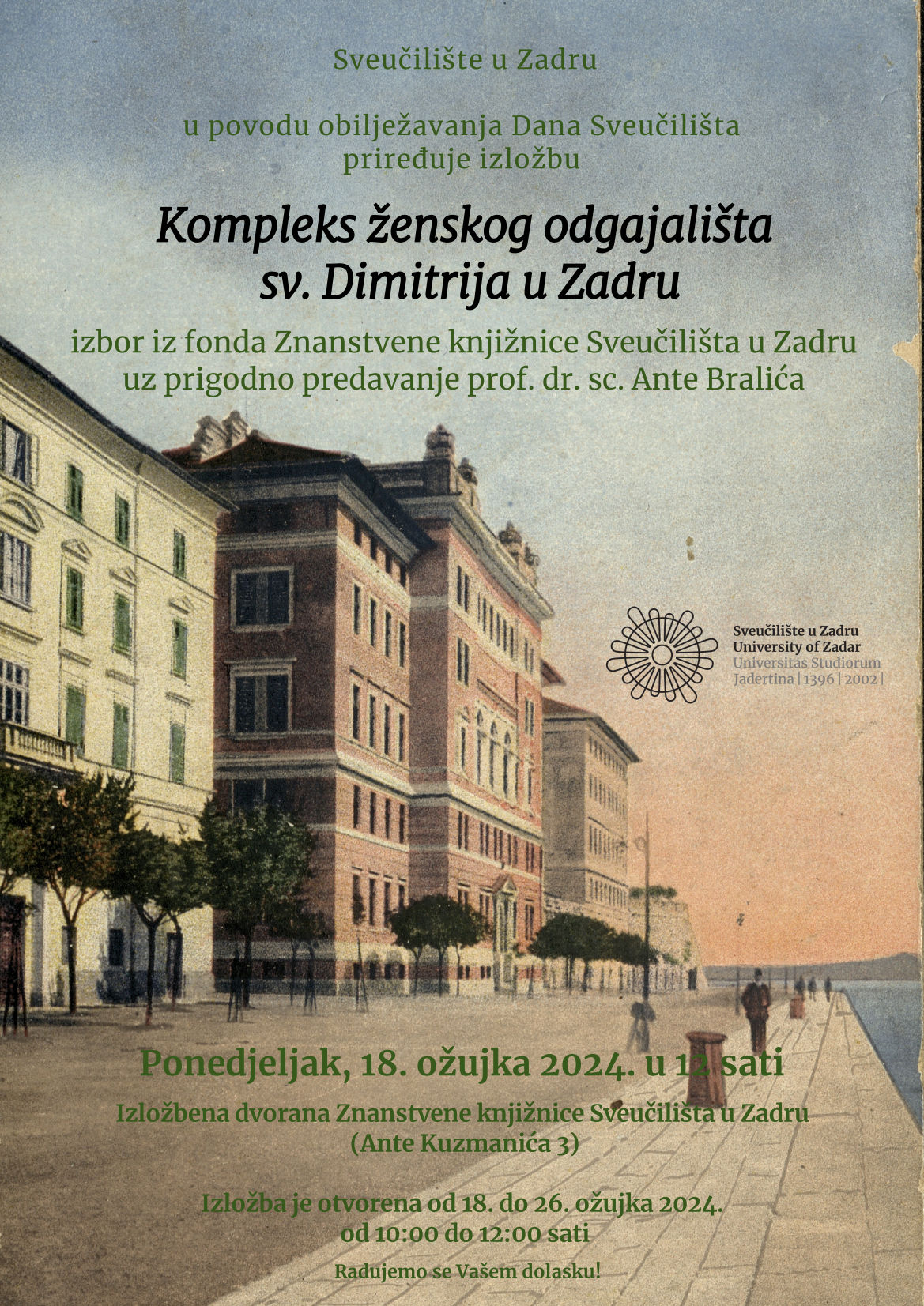 Bogatom programu ovogodišnjeg obilježavanja Dana Sveučilišta u Zadru koji će se odvijati od 18. do 27. ožujka 2024. godine priključila se i Znanstvena knjižnica Sveučilišta u Zadru prigodnom izložbom odnosno izborom iz fonda na temu bivšeg kompleksa ženskog odgajališta sv. Dimitrija u Zadru danas zgrada Starog kampusa Sveučilišta u Zadru, uz prigodno predavanje prof. dr. sc. Ante Bralića. Svečano otvorenje izložbe je u ponedjeljak, 18. ožujka 2024. u 12 sati u Izložbenoj dvorani Znanstvene knjižnice. Radujemo se vašem dolasku!