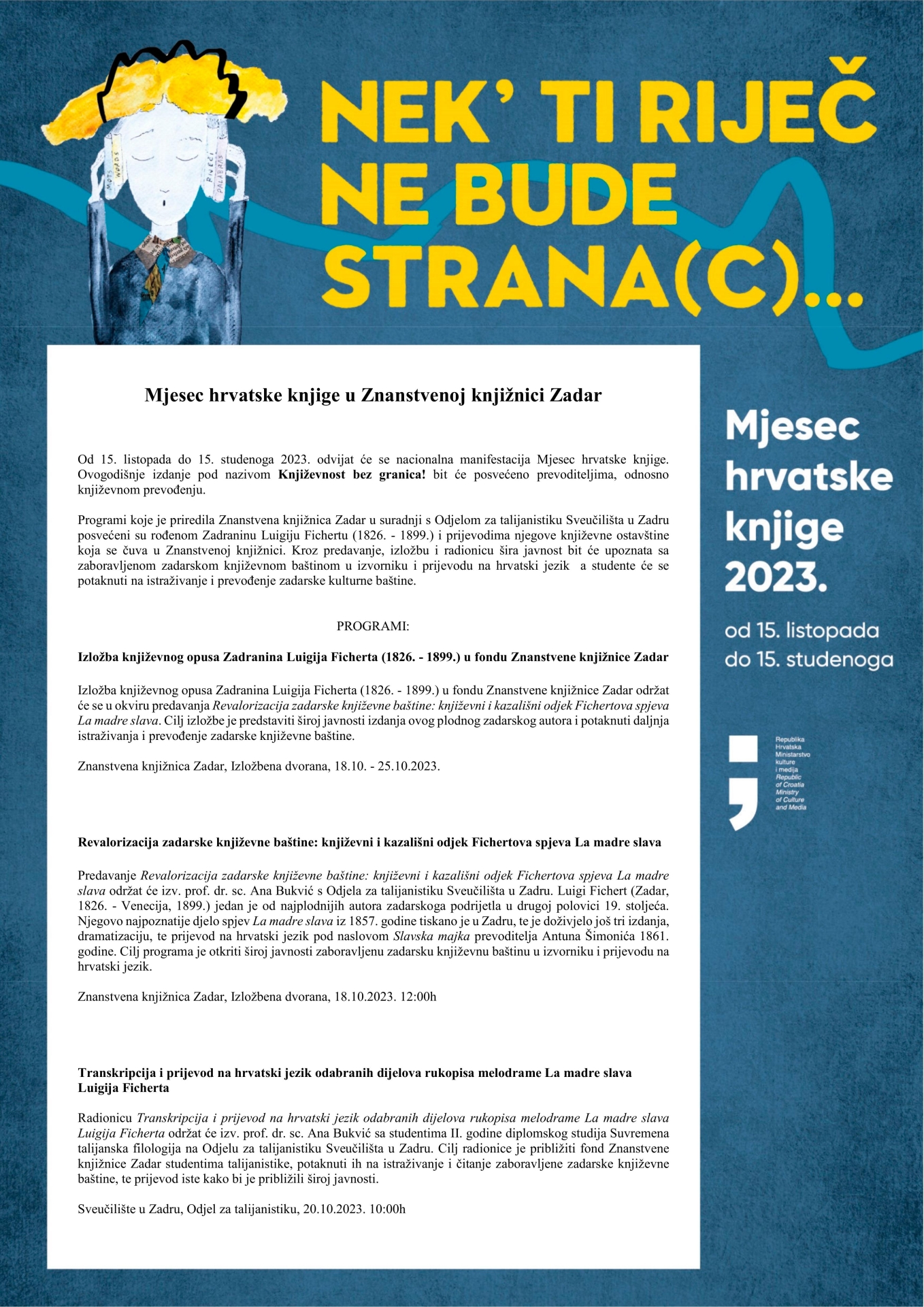 Sveučilište u Zadru, Odjel za talijanistiku, 20.10.2023. 10:00h