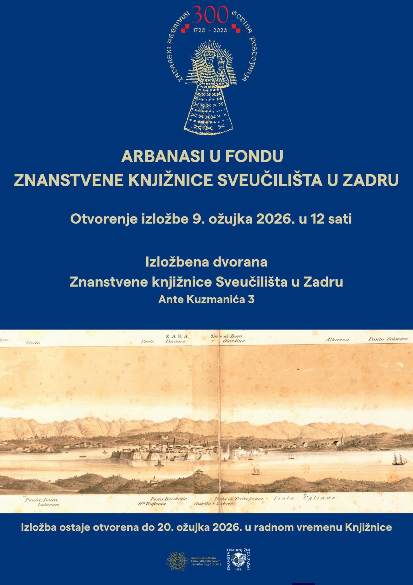 U Izložbenoj dvorani Znanstvene knjižnice Sveučilišta u Zadru (Ante Kuzmanića 3) u ponedjeljak, 9. ožujka 2026. godine u 12 sati, svečano će se otvoriti izložba „Arbanasi u fondu Znanstvene knjižnice Sveučilišta u Zadru“.