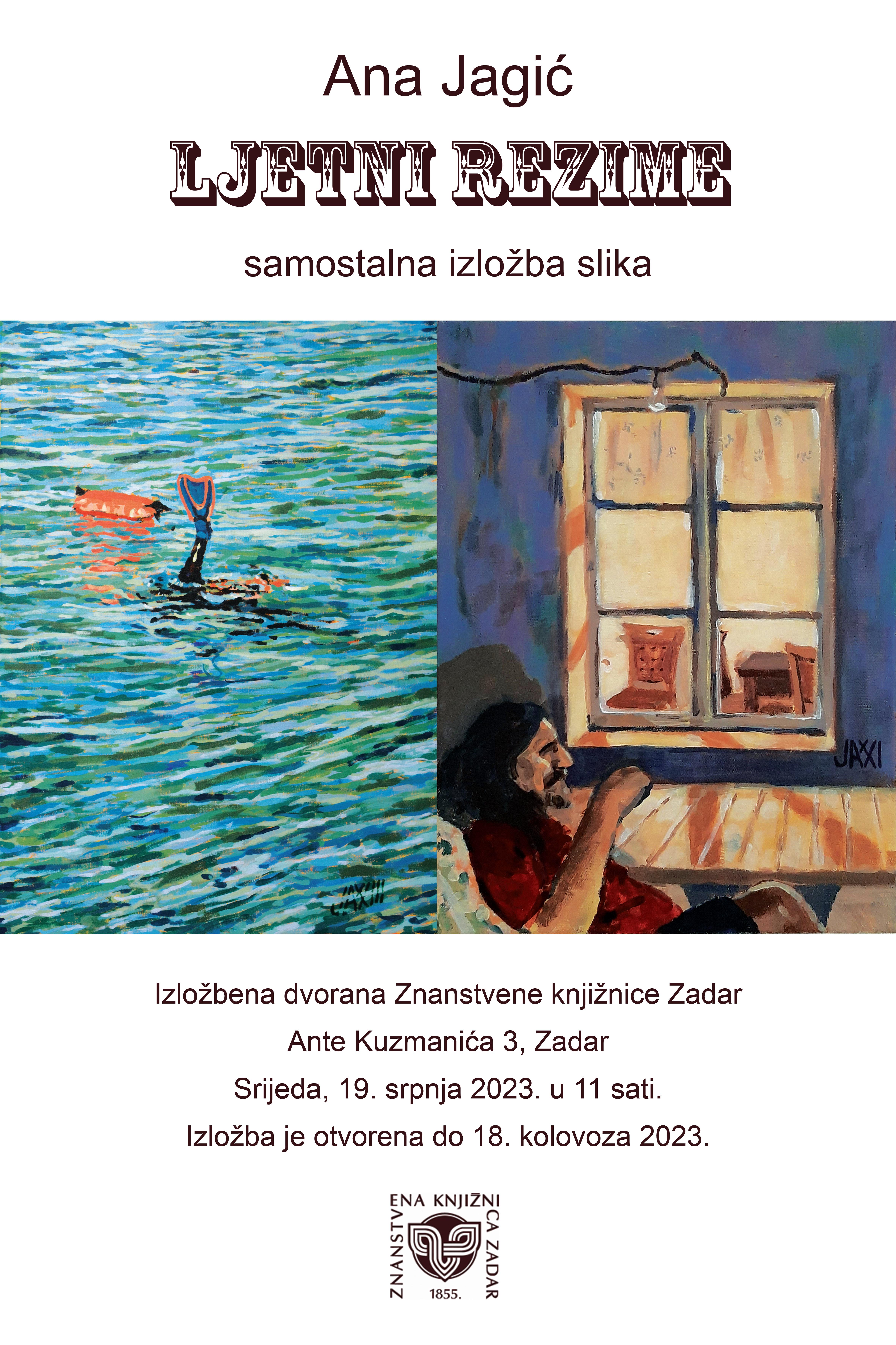 U srijedu, 19. srpnja 2023. u 11 sati, u Izložbenoj dvorani Znanstvene knjižnice Zadar otvara se samostalna izložba "Ljetni rezime" Ane Jagić.
