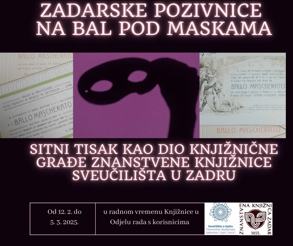 Izbor iz fonda Zadarske pozivnice na bal pod maskama: sitni tisak kao dio knjižnične građe možete pogledati od srijede 12. veljače do srijede 5. ožujka 2025. godine u radnom vremenu Knjižnice u Odjelu rada s korisnicima Znanstvene knjižnice Sveučilišta u Zadru.