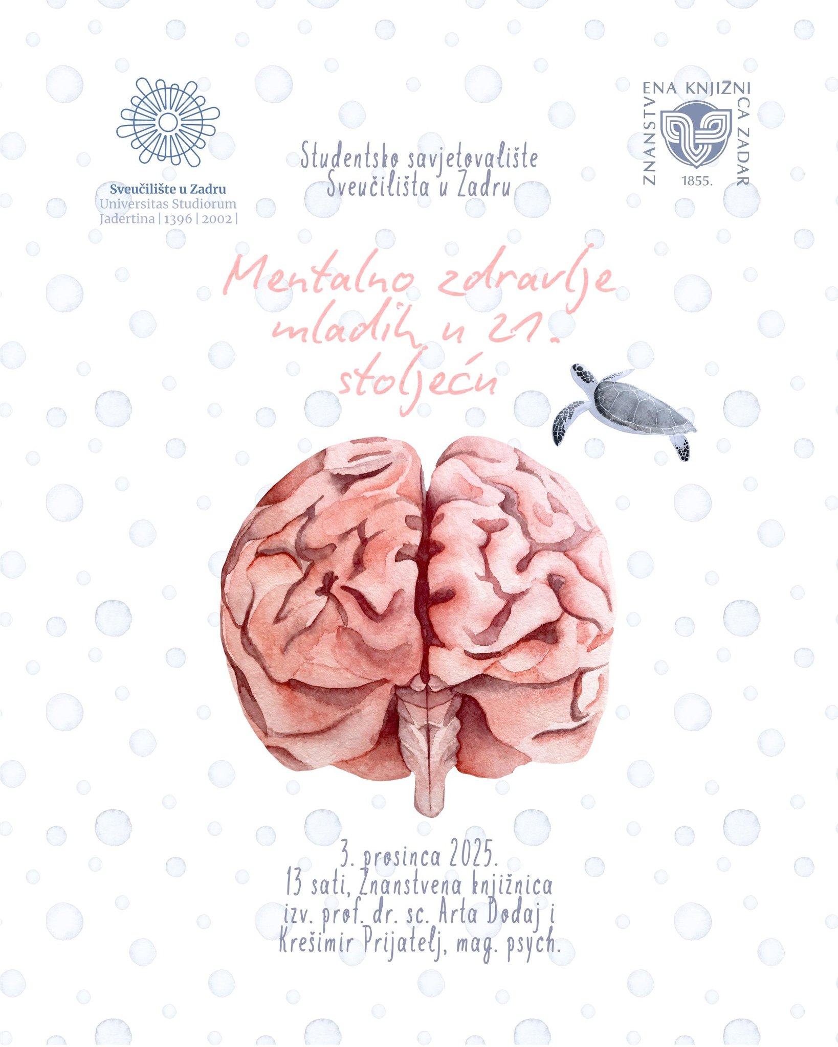 Povodom obilježavanja Međunarodnog dana osoba s invaliditetom i Međunarodnog dana ljudskih prava, Studentsko savjetovalište i Znanstvena knjižnica Sveučilišta u Zadru vas pozivaju na predavanje izv. prof. dr. sc. Arte Dodaj i Krešimira Prijatelja, mag. psych. "MENTALNO ZDRAVLJE MLADIH U 21. STOLJEĆU".