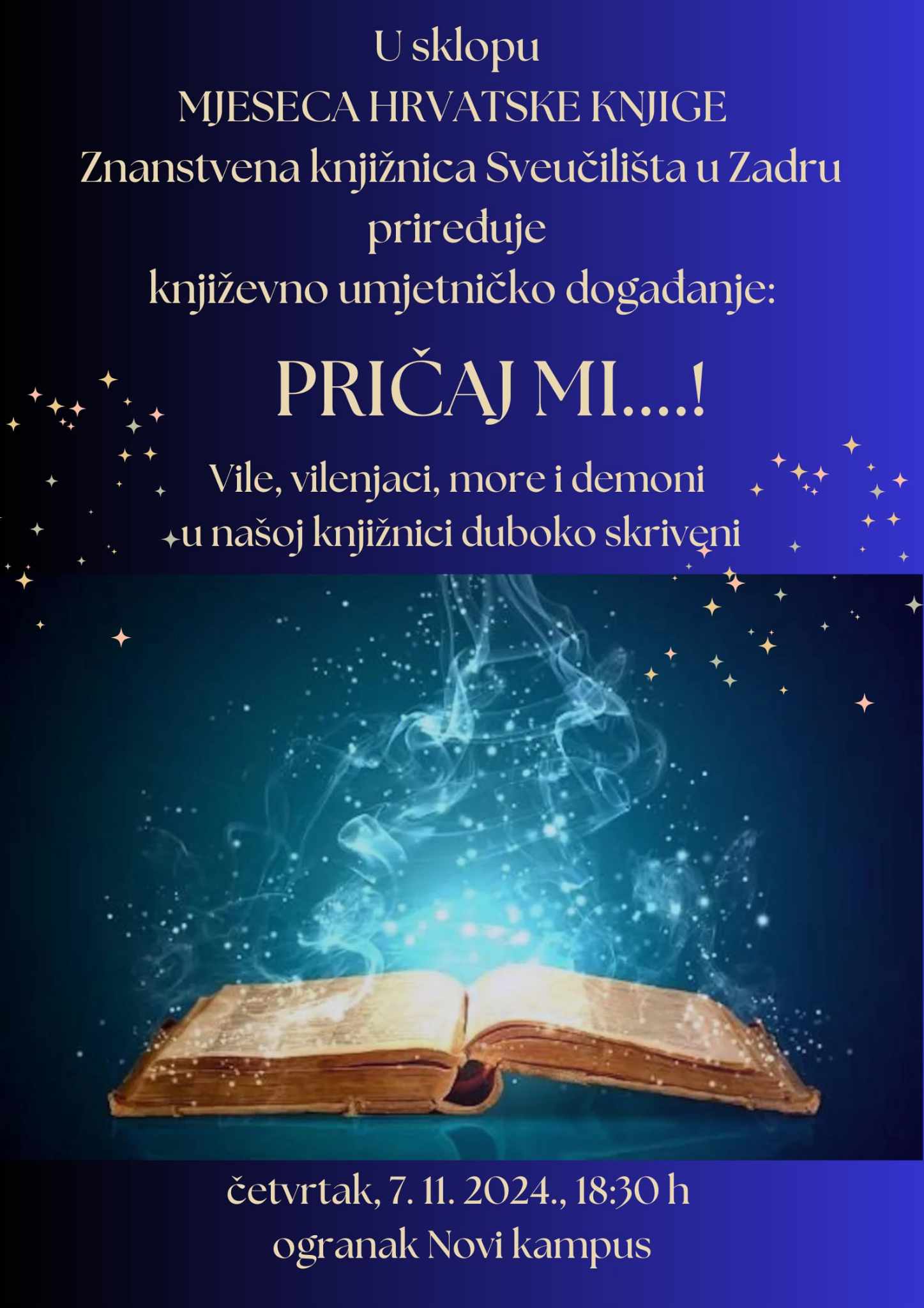 Događanje se organizira kao podrška manifestaciji „Mjesec hrvatske knjige“ čija je ovogodišnja tema pripovijedanje. Cilj je ukazati na višestruku dobrobit pripovijedanja (pričanja, čitanja...) za sve dobne skupine, a osobito za studentsku generaciju. Želi se istaknuti i iznimna važnost knjižnica i njihovih višestrukih informacijskih izvora u kojima se kriju kako novije, tako i one drevne priče i predaje koje ovom prigodom želimo oživjeti i očuvati. Na samom kraju događanja imat ćemo priliku čuti i nekoliko, upravo za ovu prigodu napisanih, kratkih priča naših studenata i knjižničara. Vidimo se!