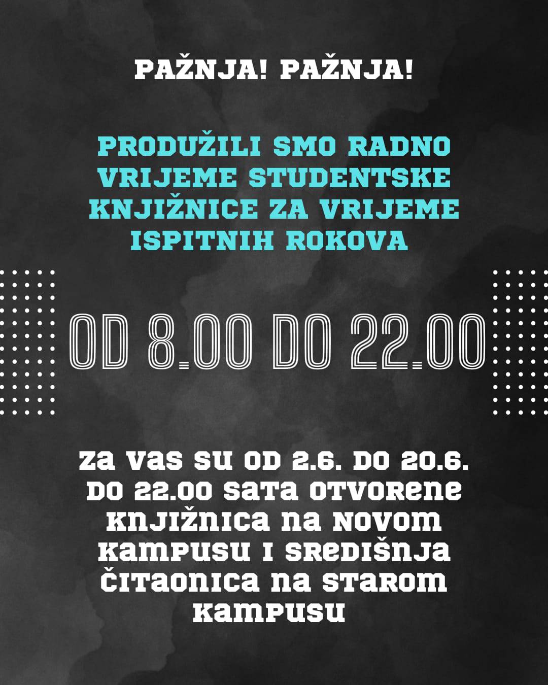 PRODUŽENO RADNO VRIJEME STUDENTSKE KNJIŽNICE ZA VRIJEME ISPITNOG RAZDOBLJA