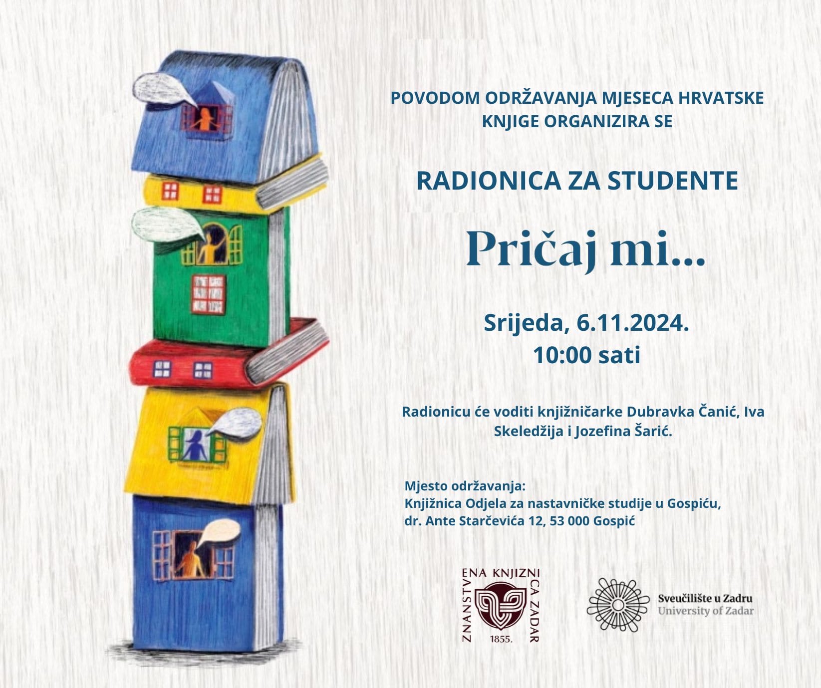 Knjižnični ogranak Odjela za nastavničke studije u Gospiću Znanstvene knjižnice Sveučilišta u Zadru poziva vas na zanimljivu radionicu "Pričaj mi" koja će se održati 6. studenoga u 10 sati u okviru obilježavanja Mjeseca hrvatske knjige!