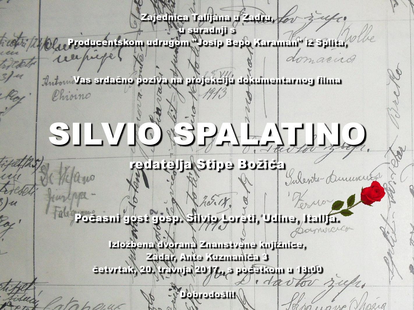 U četvrtak, 20. travnja u 18,00 sati u Izložbenoj dvorani Znanstvene knjižnice održat će se projekcija dokumentarnog filma "SILVIO SPALATINO" redatelja Stipe Božića.