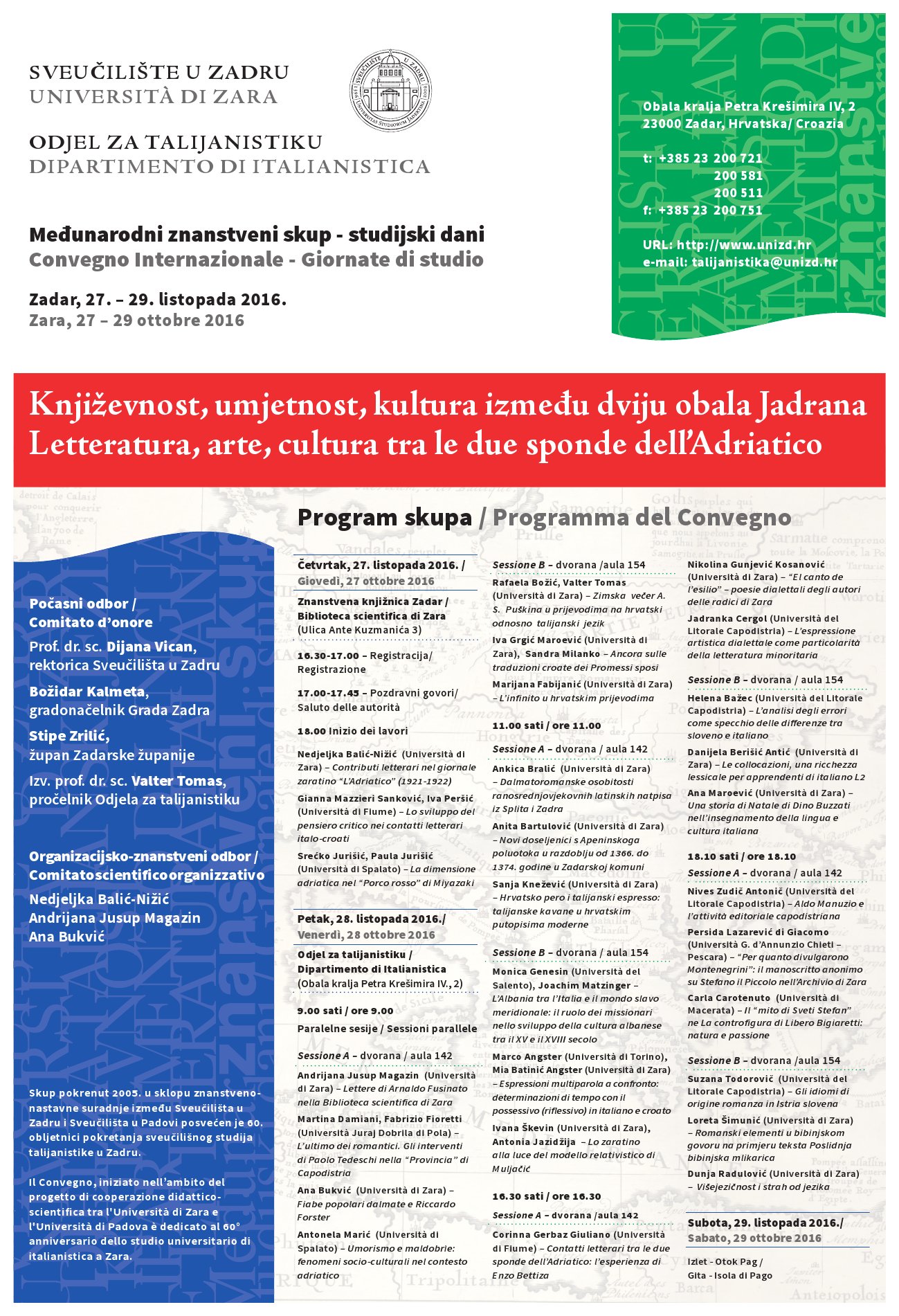 U četvrtak, 27. listopada u 17,00 sati otvorenje 11. međunarodnog znanstvenog skupa "KNJIŽEVNOST, UMJETNOST, KULTURA IZMEĐU DVIJU OBALA JADRANA - LETTERATURA, ARTE, CULTURA TRA LE DUE SPONDE DELL’ADRIATICO"