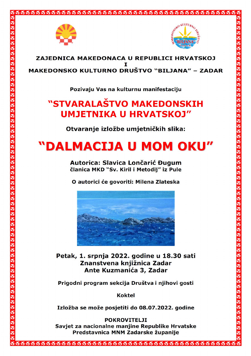 Izložbu u sklopu kulturne manifestacije "STVARALAŠTVO MAKEDONSKIH UMJETNIKA U HRVATSKOJ" priređuju Zajednica Makedonaca u Republici Hrvatskoj i Makedonsko kulturno društvo "Biljana" - Zadar, a ostaje otvorena do 8. srpnja.