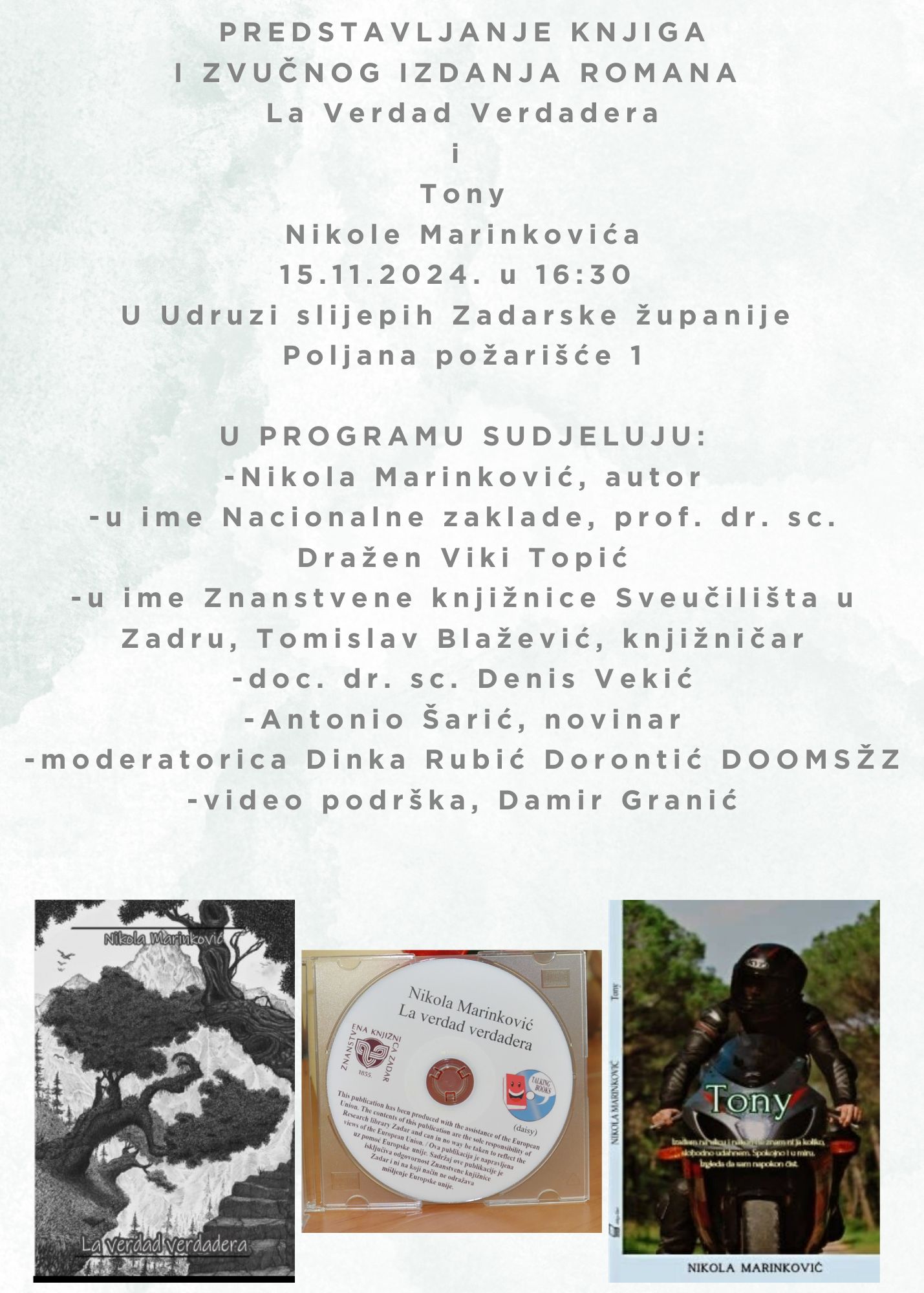 U Udruzi slijepih Zadarske županije (Poljana Požarišće 1) u petak 15. studenoga s početkom u 16:30 sati održat će se predstavljanje knjiga autora Nikole Marinkovića. Radi se o dva romana La Verdad Verdadera i Tony, te zvučni format romana La Verdad Verdadera produciran u Studiju za snimanje zvučnih knjiga Znanstvene knjižice Sveučilišta u Zadru namijenjen slijepim i slabovidnim osobama.