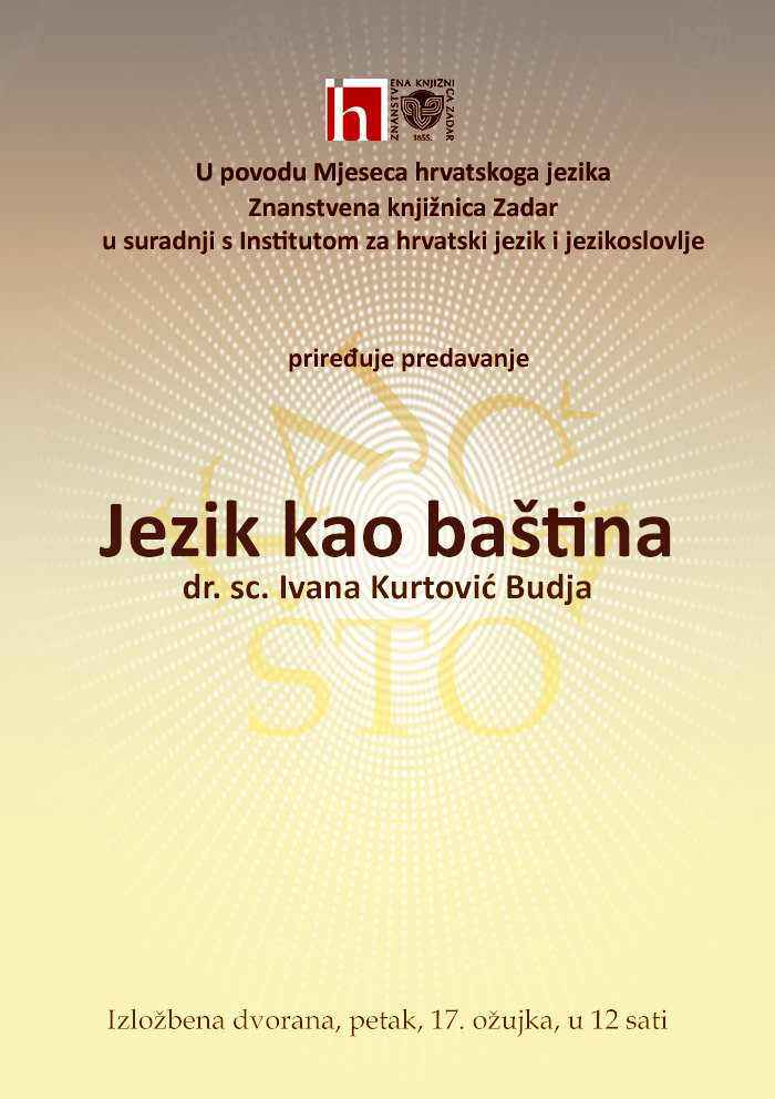 U povodu Mjeseca hrvatskog jezika Znanstvena knjižnica Zadar u suradnji s Institutom za hrvatski jezik i jezikoslovlje priređuje predavanje dr. sc. Ivane Kurtović Budja pod nazivom „Jezik kao baština“.