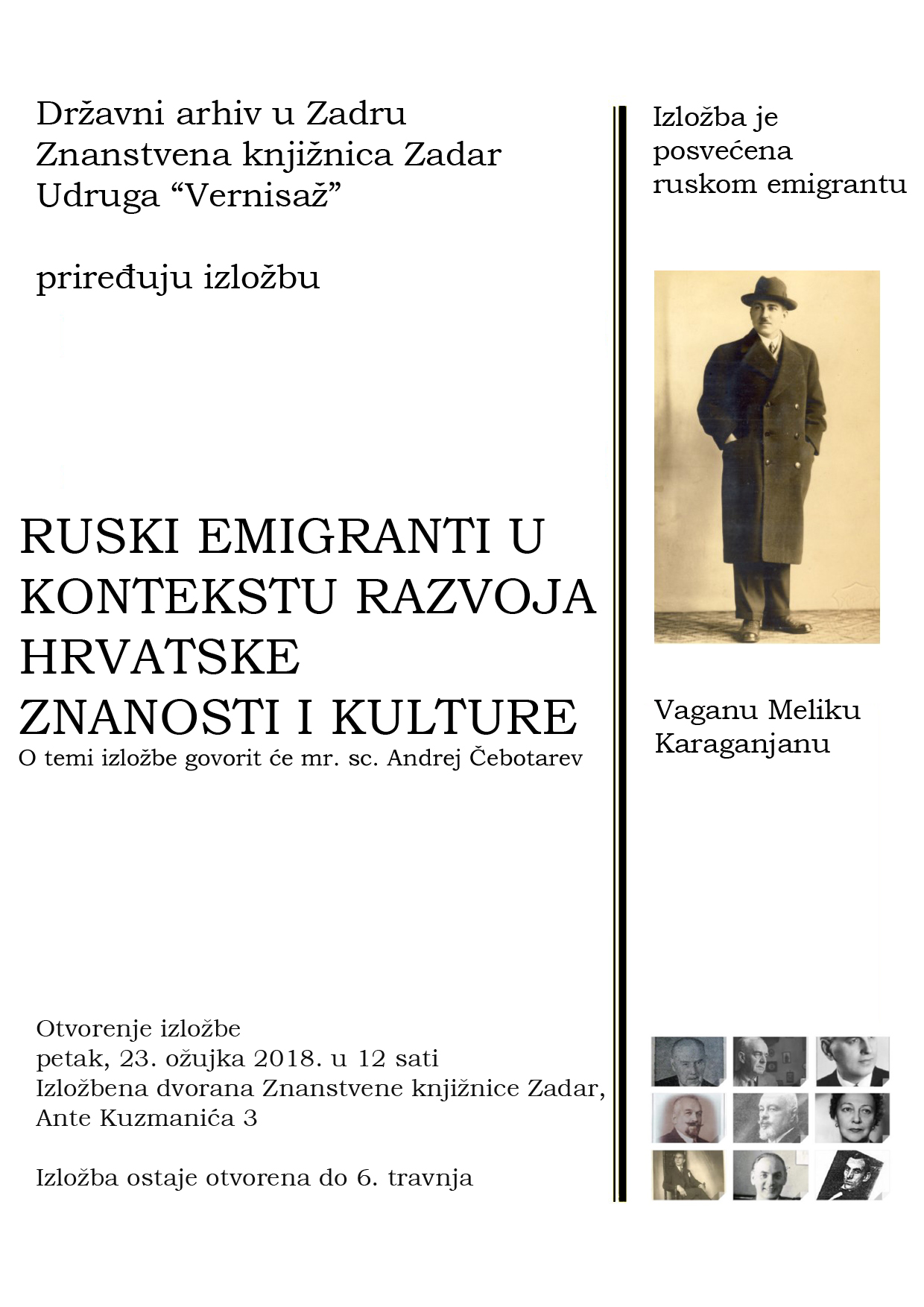 Izložba je posvećena ruskom emigrantu Vaganu Meliku Karaganjanu. O temi izložbe govorit će mr. sc. Andrej Čebotarev.