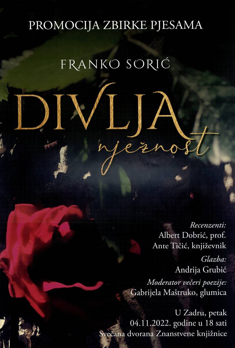 U petak, 4. studenoga u 18,00 sati u Izložbenoj dvorani Znanstvene knjižnice održat će se predstavljanje zbirke pjesama "Divlja nježnost", autora Franka Sorića. Uz autora knjigu će predstaviti i recenzenti - Albert Dobrić i Ante Tičić. Moderator predstavljanja je Gabrijela Maštruko, glumica. Za glazbeni predah zadužen je zadarski glazbenik Andrija Grubić.