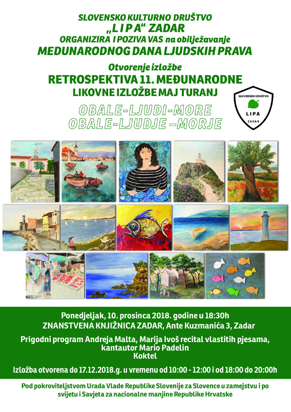 U ponedjeljak, 10. prosinca u 18,30 sati u Izložbenoj dvorani Znanstvene knjižnice otvorit će se "RETROSPEKTIVA 11. MEĐUNARODNE LIKOVNE IZLOŽBE MAJ TURANJ: OBALE - LJUDI - MORE", koju priređuje Slovensko kulturno društvo "Lipa" Zadar povodom obilježavanja Međunarodnog dana ljudskih prava.