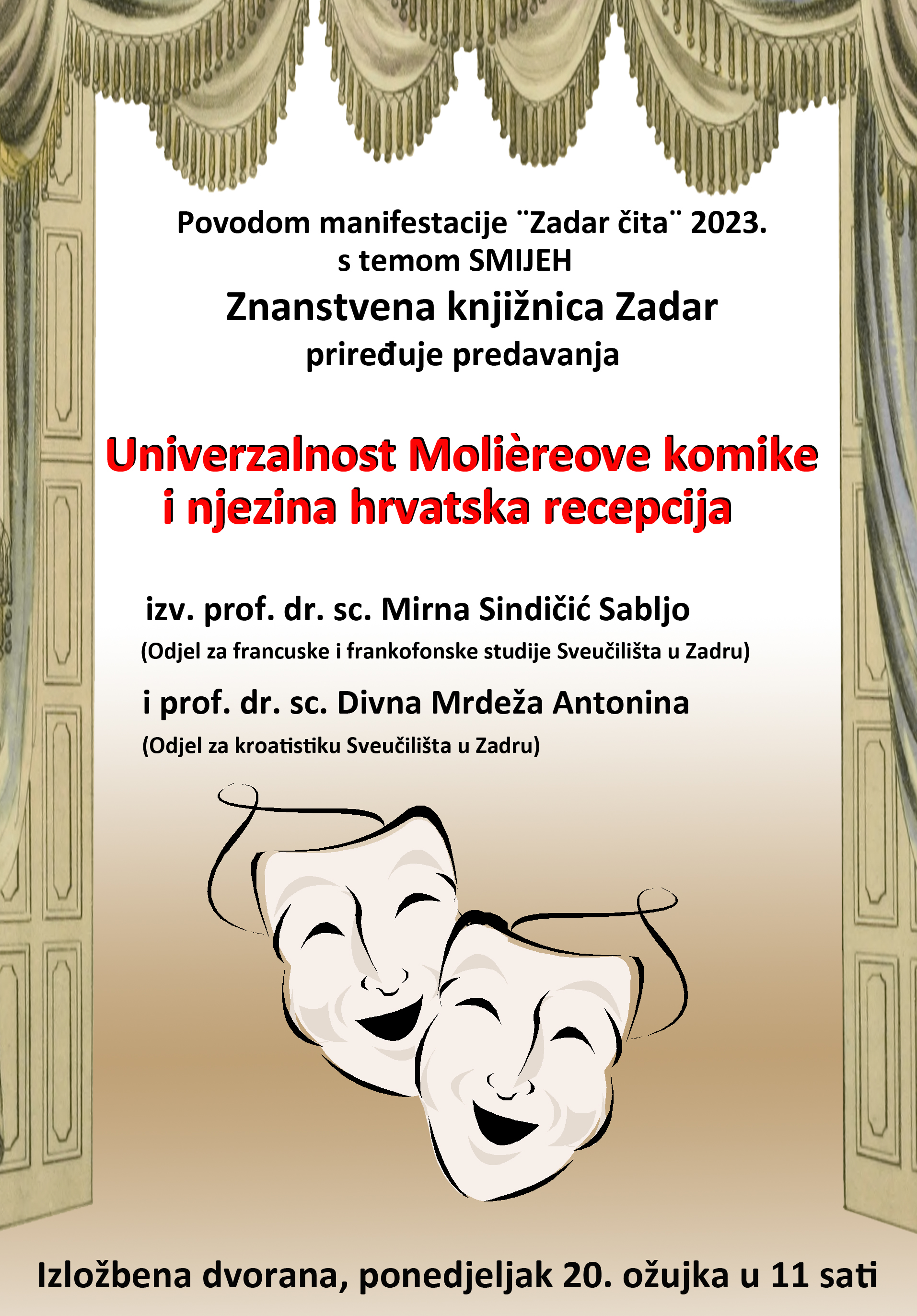 U povodu manifestacije Zadar čita u Znanstvenoj knjižnici Zadar održat će se predavanja "UNIVERZALNOST MOLIEREOVE KOMIKE I NJEZINA HRVATSKA RECEPCIJA". Predavanja će održati izv. prof. dr. sc. Mirna Sindičić Sabljo (Odjel za fancuske i frankofonske studije Sveučilišta u Zadru) i prof. dr. sc. Divna Mrdeža Antonina (Odjel za kroatistiku Sveučilišta u Zadru).