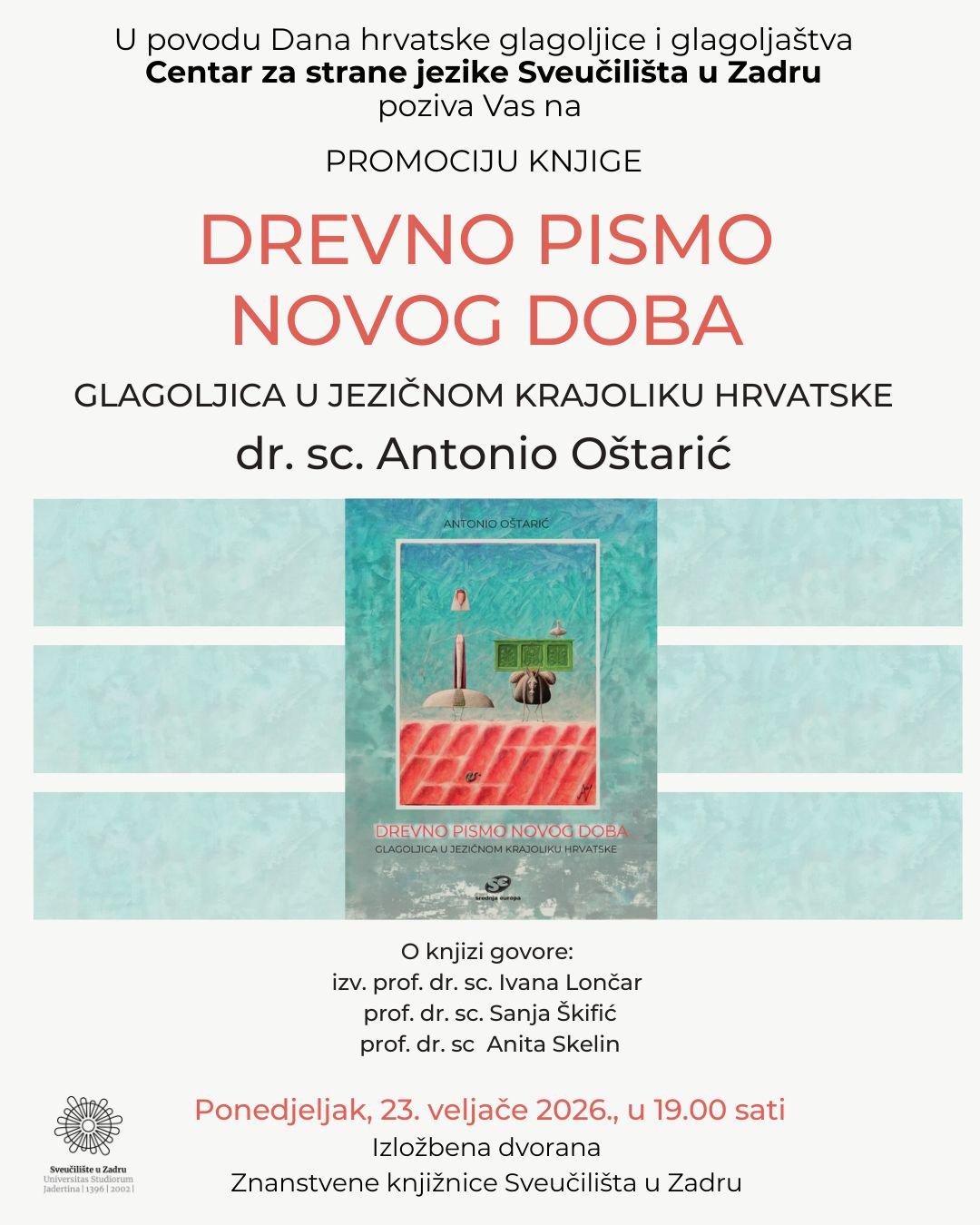 Promocija će se održati u ponedjeljak 23. veljače 2026. s početkom u 19 sati u Izložbenoj dvorani Znanstvene knjižnice Sveučilišta u Zadru.