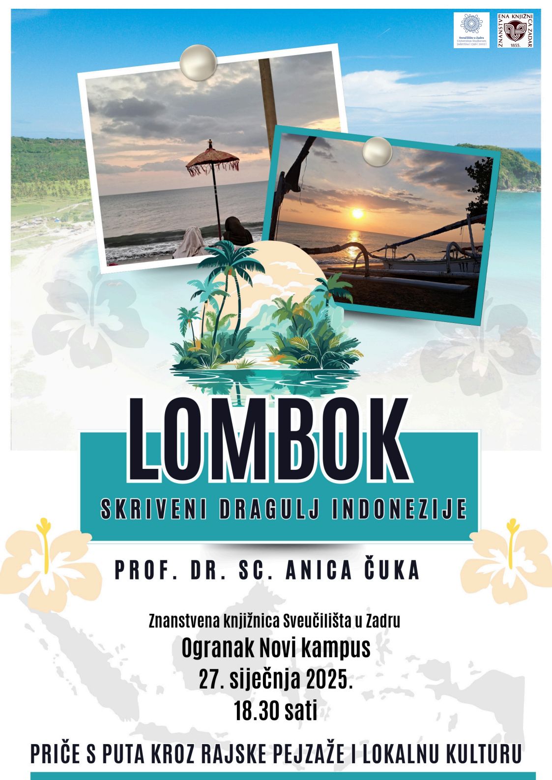 Znanstvena knjižnica Sveučilišta u Zadru poziva vas na javno predavanje pod nazivom Lombok: skriveni dragulj Indonezije - priče s puta kroz rajske plaže i lokalnu kulturu prof. dr. sc. Anice Čuka s Odjela za geografiju Sveučilišta u Zadru.