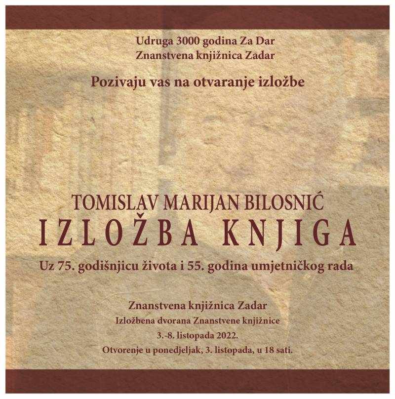 U ponedjeljak 3. listopada 2022. godine s početkom u 18 sati u Izložbenoj dvorani Znanstvene knjižnice Zadar, otvara se Izložba knjiga Tomislava Marijana Bilosnića. Izložba je upriličena uz Bilosnićev jubilej - 75. godišnjicu života i 55. godišnjicu umjetničkog rada.