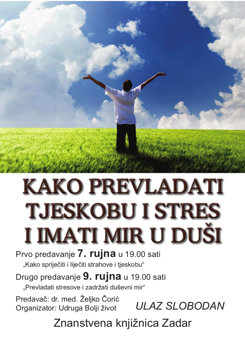 Predavanje organizira Udruga "Bolji život" u sklopu ciklusa "KAKO PREVLADATI TJESKOBU I STRES I IMATI MIR U DUŠI", u kojem će biti riječi o važnosti pravilnog suočavanja sa stresom te o ulozi povjerenja i duševnog mira u prevenciji i liječenju najčešćih bolesti današnjice kao što su srčani i moždani udari, rak, povišeni krvni tlak i masnoće, dijabetes, slab imunitet, psihičke bolesti itd.