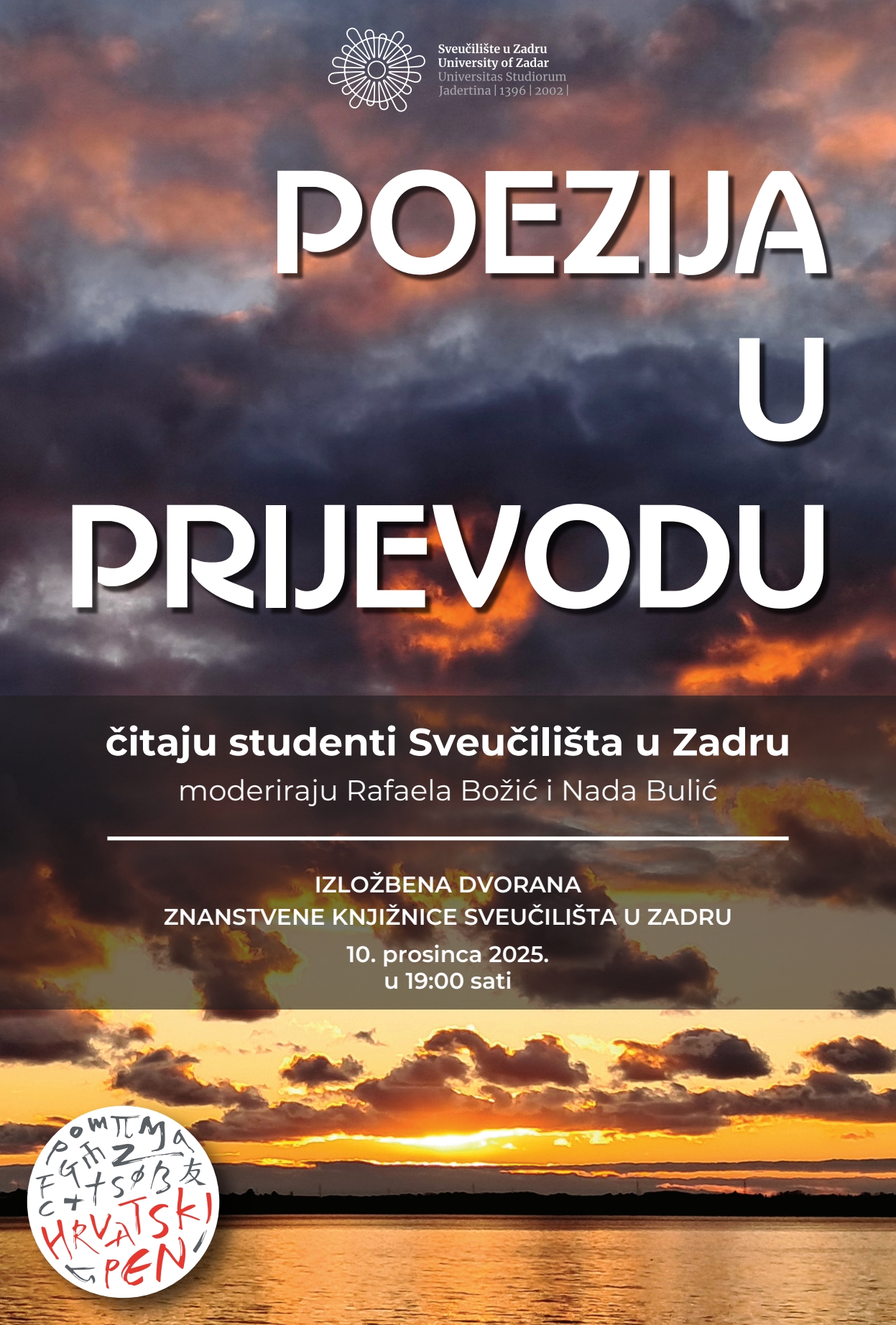 Sveučilište u Zadru i Hrvatski P.E.N. centar pozivaju vas na književnu večer Poezija u prijevodu, u srijedu 10. prosinca u 19:00 sati, u prostoru Izložbene dvorane Znanstvene knjižnice Sveučilišta u Zadru!