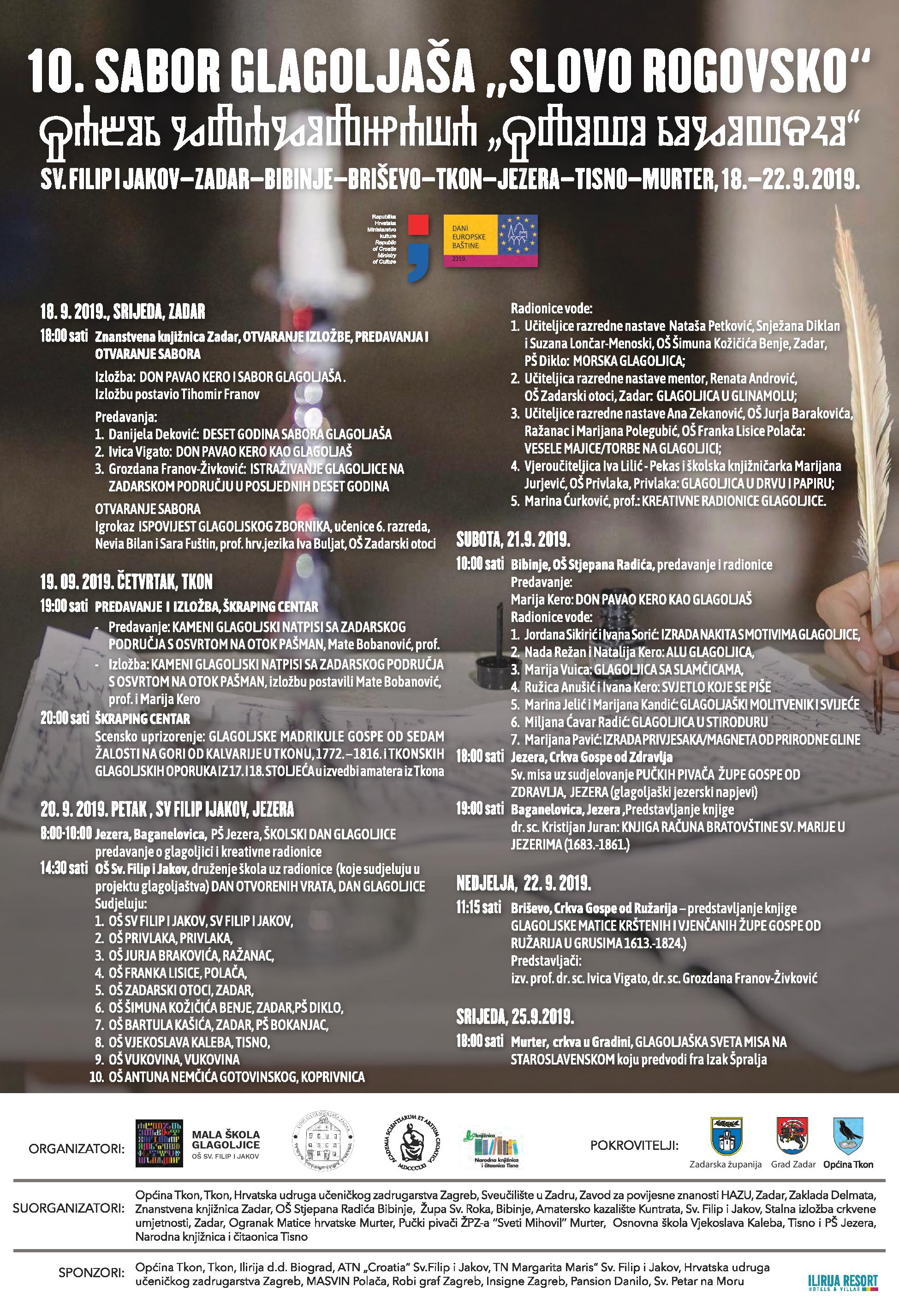 U srijedu, 18. rujna u 18,00 sati u Izložbenoj dvorani Znanstvene knjižnice Zadar svečano će se otvoriti 10. sabor glagoljaša "SLOVO ROGOVSKO 2019." te izložba "Don Pavao Kero i sabor glagoljaša" autora Tihomira Franova.