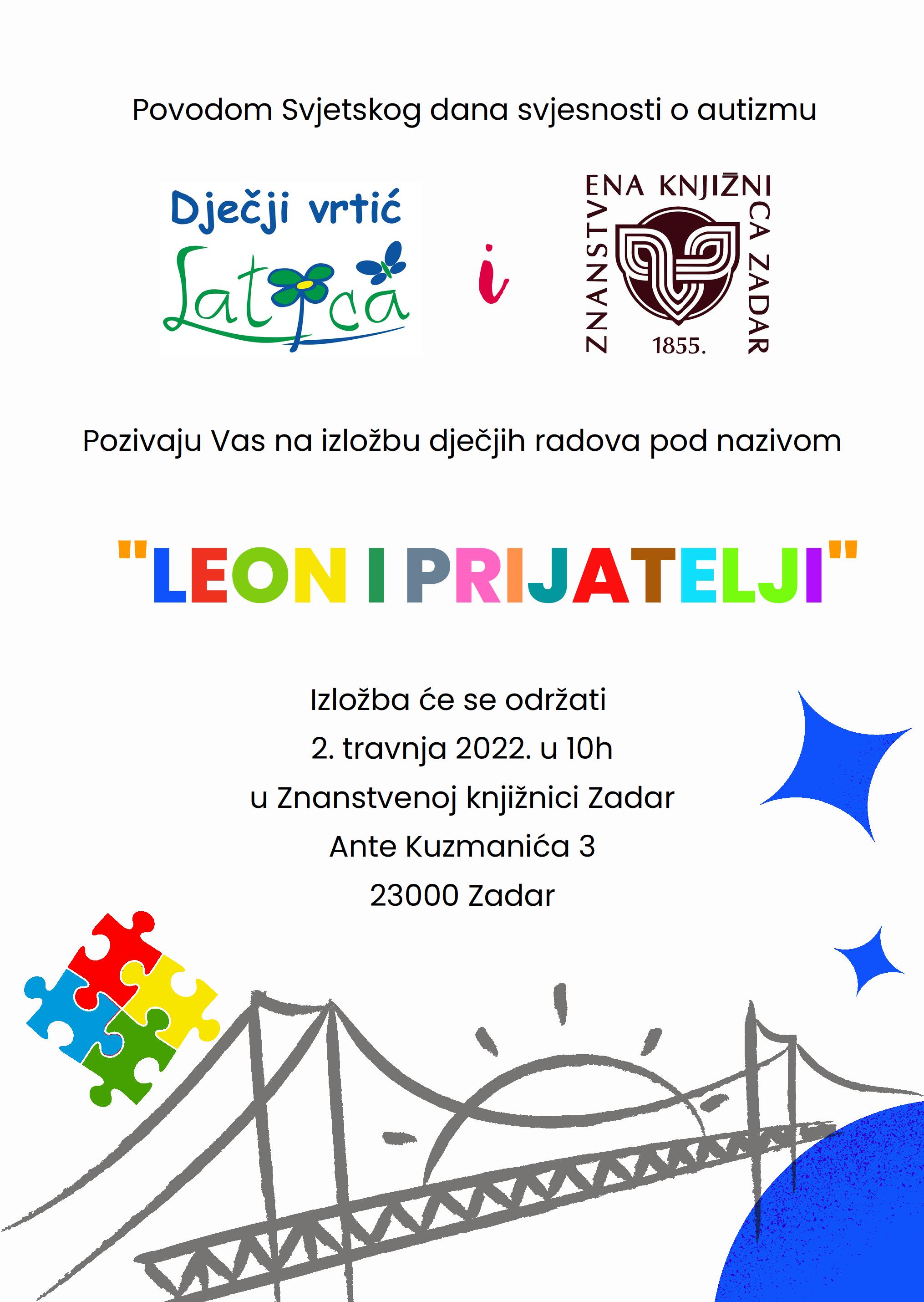 Povodom Svjetskog dana svjesnosti o autizmu, Dječji vrtić Latica u suradnji sa Znanstvenom knjižnicom Zadar u subotu, 2. travnja 2022. godine s početkom u 10 sati organizira izložbu likovnih radova dječaka Leona Baila i njegovih prijatelja iz skupine, polaznika Dječjeg vrtića Latica.