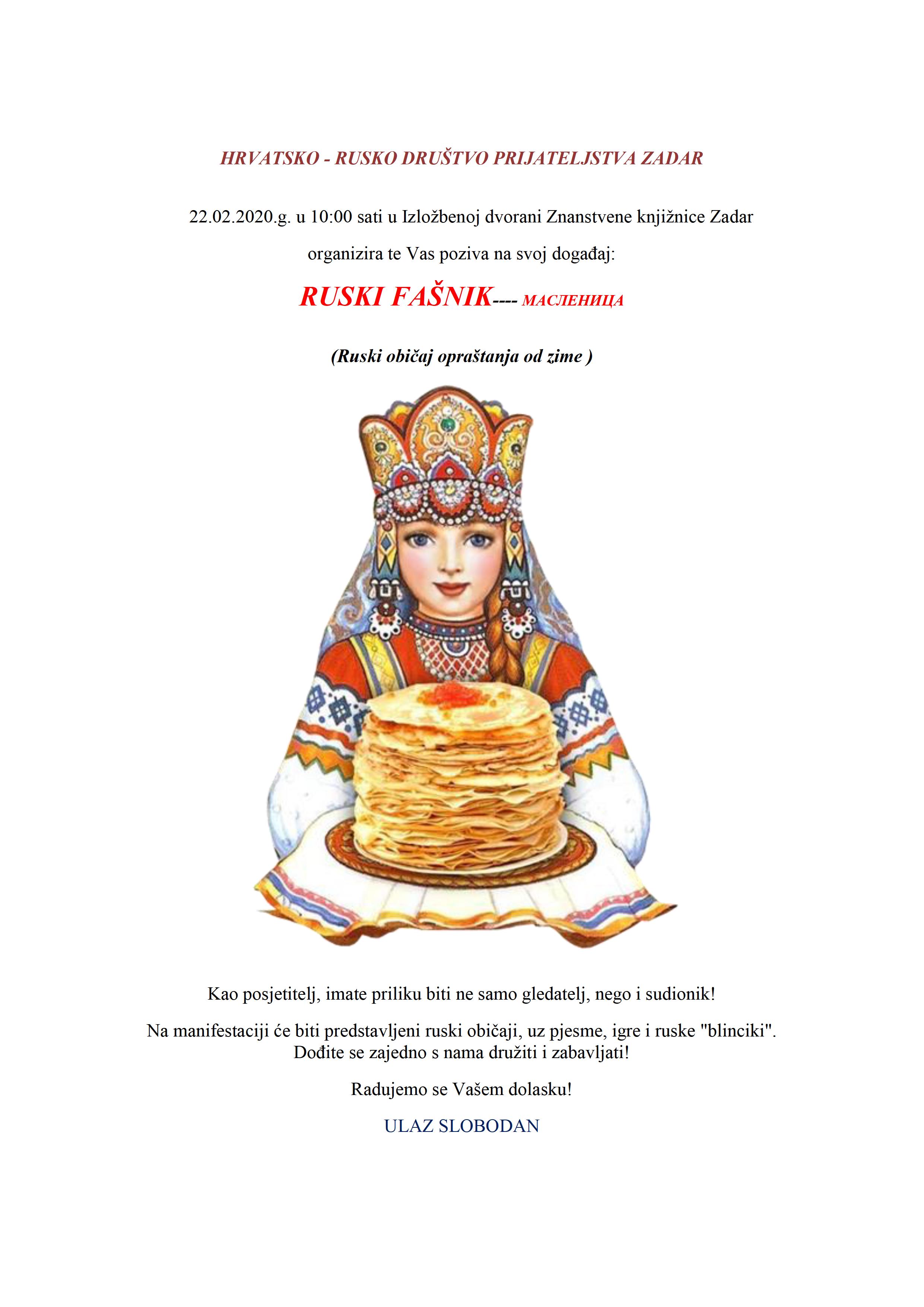 U subotu, 22. veljače u 10,00 sati u Izložbenoj dvorani Znanstvene knjižnice održat će događaj "RUSKI FAŠNIK - MASLENICA", na kojem će biti predstavljen ruski običaj opraštanja od zime.