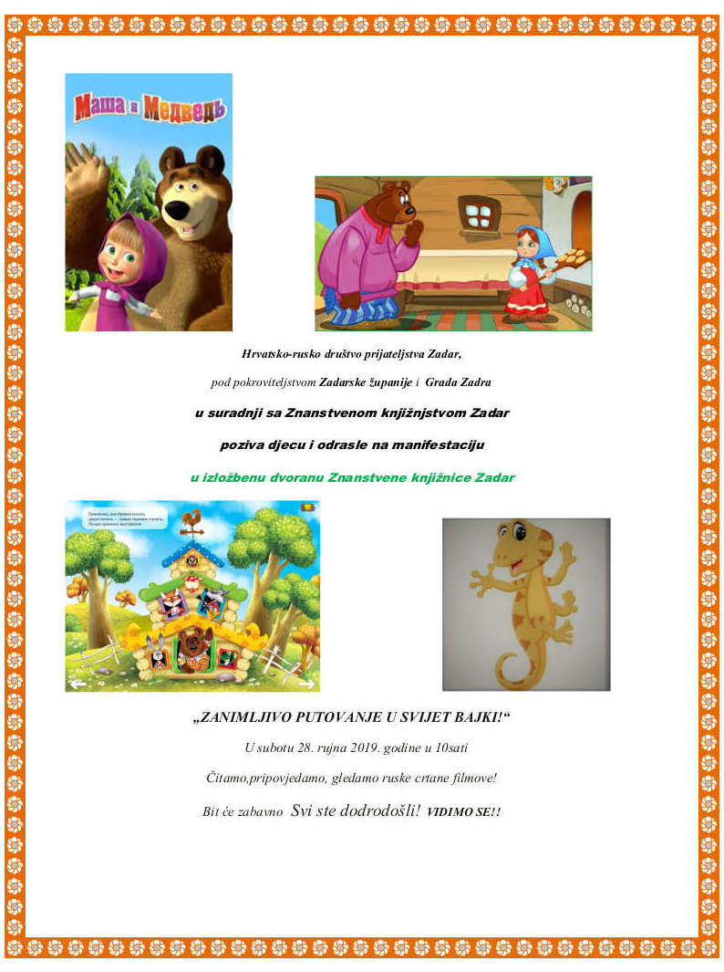 U subotu, 28. rujna s početkom u 10,00 sati u Izložbenoj dvorani Znanstvene knjižnice održat će se manifestacija za djecu i odrasle "ZANIMLJIVO PUTOVANJE U SVIJET RUSKE BAJKE".