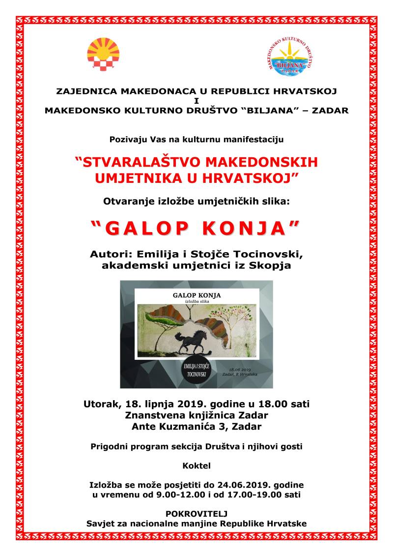 U utorak, 18. lipnja u 18,00 sati u Izložbenoj dvorani Znanstvene knjižnice Zadar otvorit će se izložba umjetničkih slika ''GALOP KONJA'' autora Emilije i Stojčeta Tocinovski, akademskih umjetnika iz Skopja.