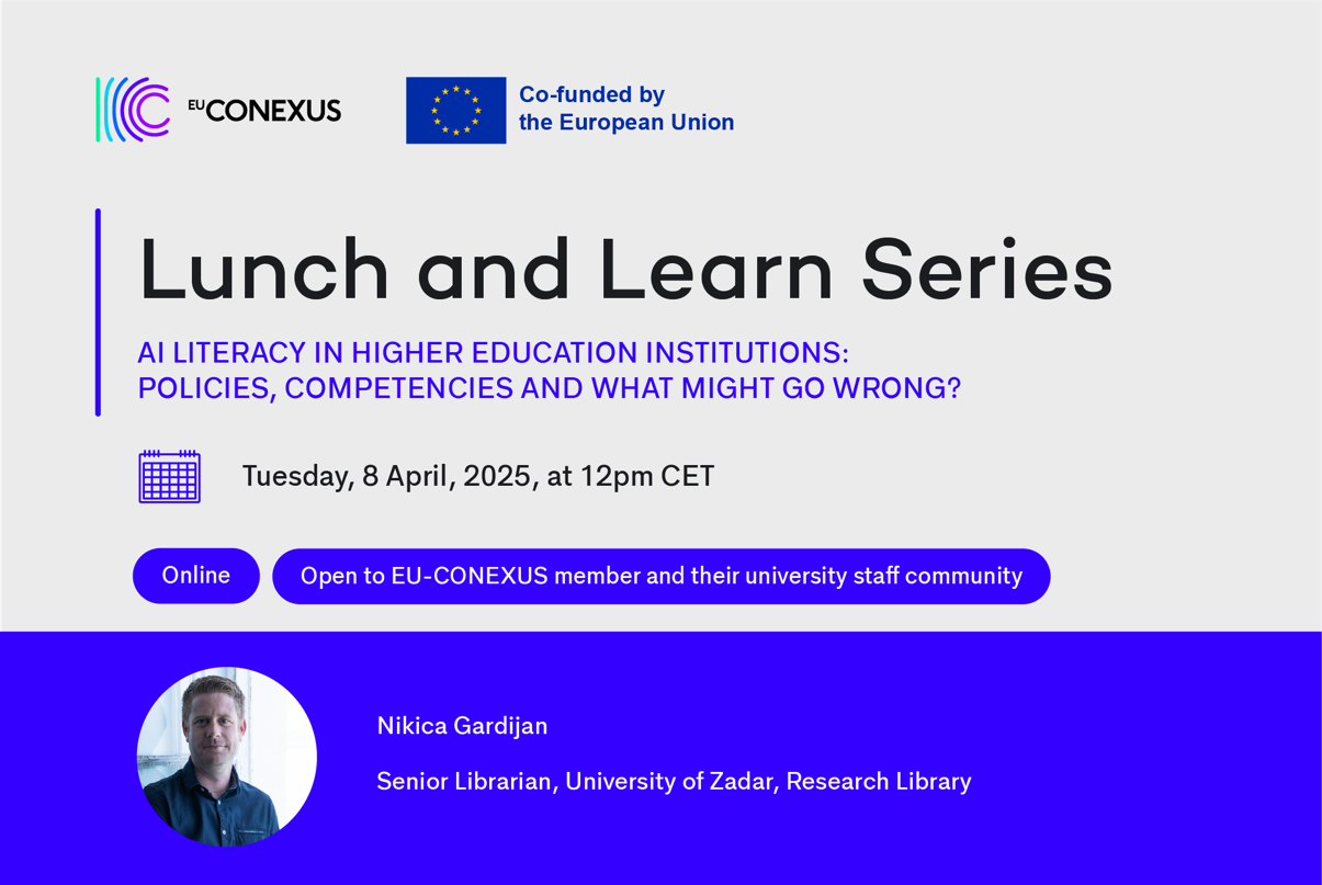 U organizaciji EU CONEXUS Karijernog centra pozivamo vas da se pridružite online predavanju na engleskom jeziku pod nazivom AI Literacy in Higher Education Institutions: Policies, Competencies and What Might Go Wrong?