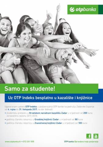 Studenti koji u razdoblju od 04. rujna do 31. listopada 2017. ugovore paket OTP Indeks na poklon dobivaju studentsku pretplatu Hrvatskog narodnog kazališta Zadar te članske iskaznice Gradske knjižnice Zadar i Znanstvene knjižnice Zadar.