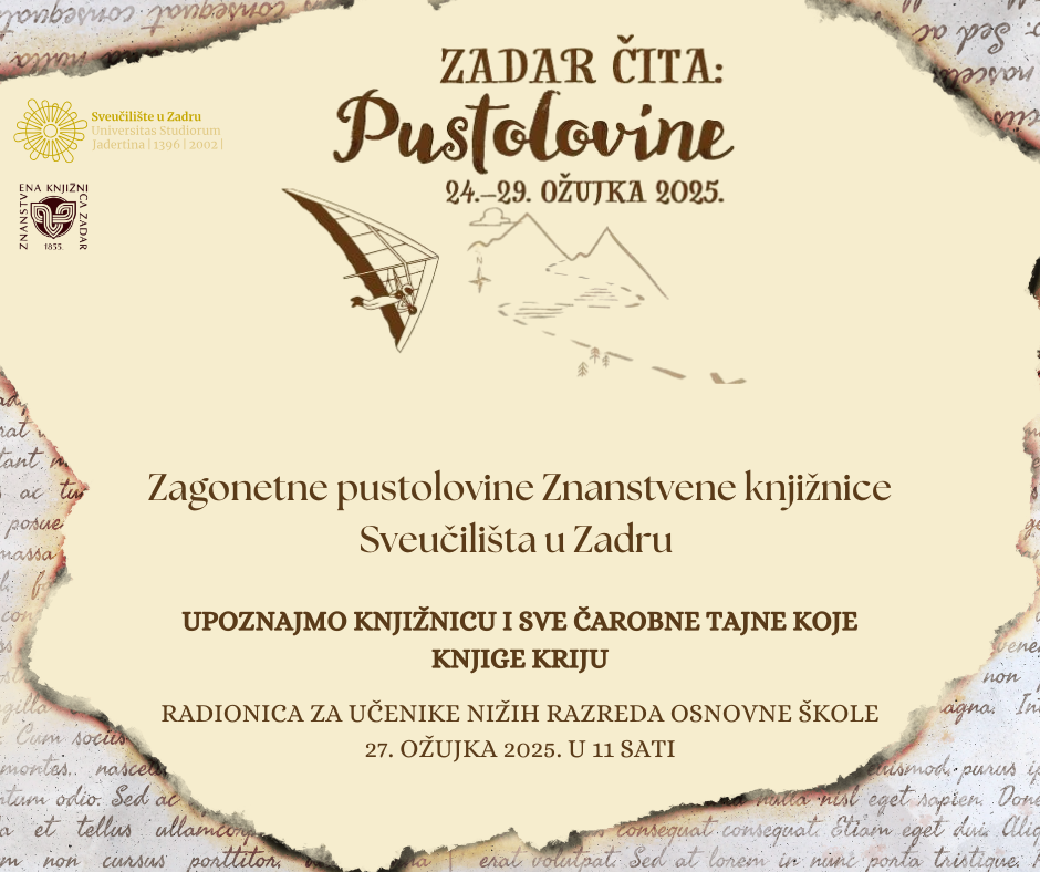 U sklopu manifestacije "Zadar čita 2025.", učenici 3. razreda OŠ Petar Preradović pozvani su na uzbudljivu radionicu pod nazivom "Zagonetne pustolovine Znanstvene knjižnice Sveučilišta u Zadru", koja će se održati u četvrtak, 27. ožujka, s početkom u 11 sati, u prostoru Odjela rada s korisnicima Znanstvene knjižnice Sveučilišta u Zadru.