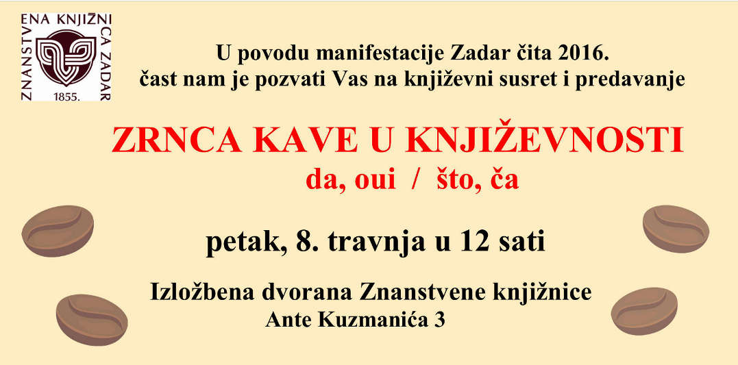 U petak, 8. travnja u 12 sati u Izložbenoj dvorani Znanstvene knjižnice održat će se književni susret i predavanje Zrnca kave u književnosti : da, oui / što, ča u povodu manifestacije Zadar čita 2016.